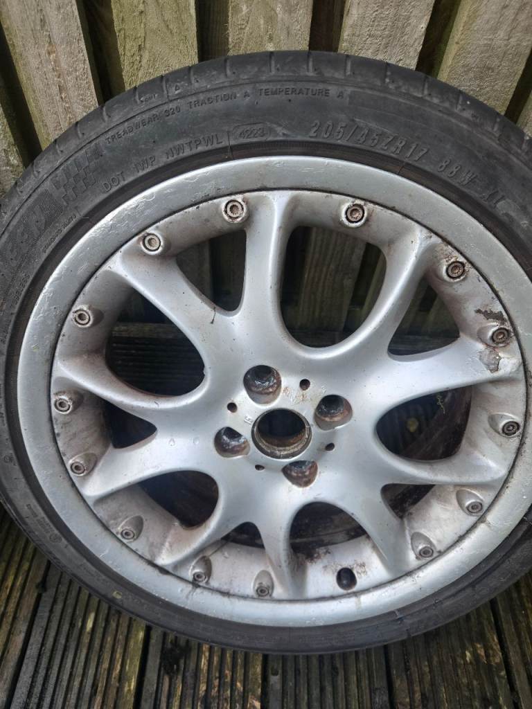For sale is a set of 4 genuine split rim Mini one / cooper alloys with 2 near new tyres and 2 used legal tread tyres. Tyres are a mix of entry level quality. Sized 205/45/17. They require a full refurbishment. I was told that one of the wheels had a buckle. Not sure if thats true or the refurb guy didnt want to do the work involved in these rims. So bought another set. Hence sale price. Sold as seen.