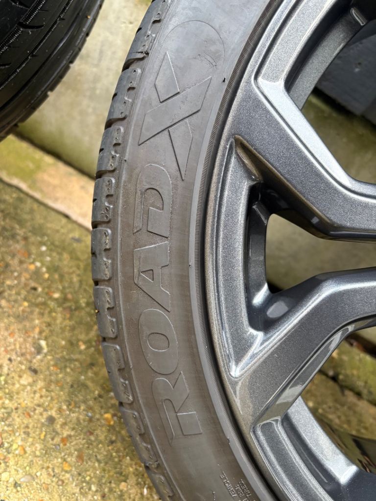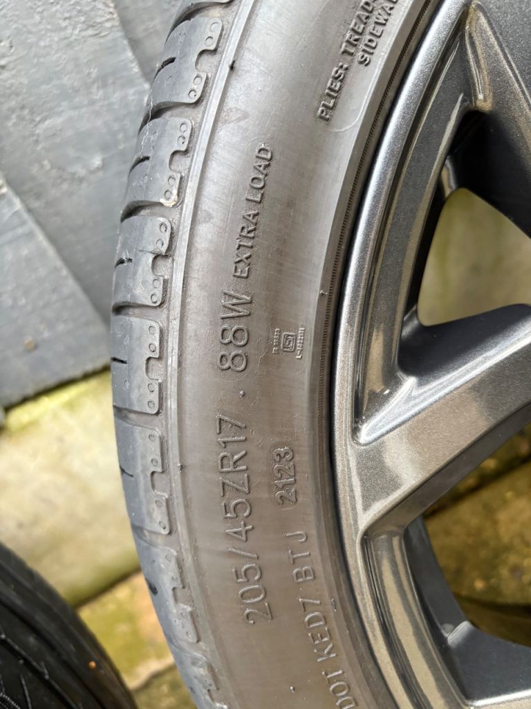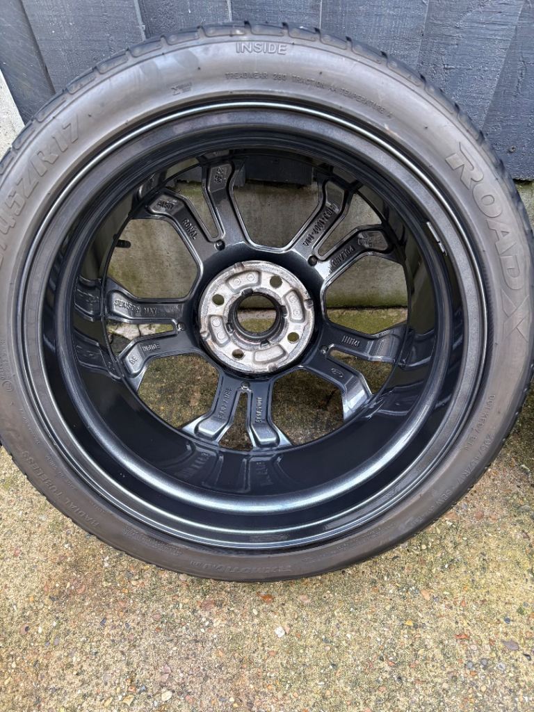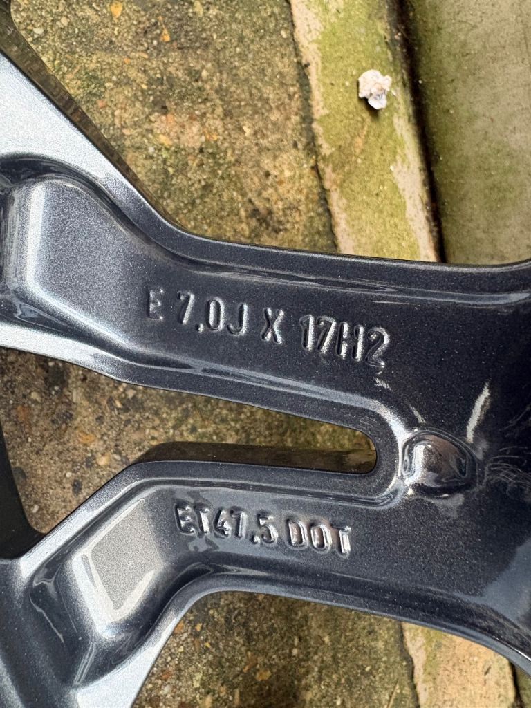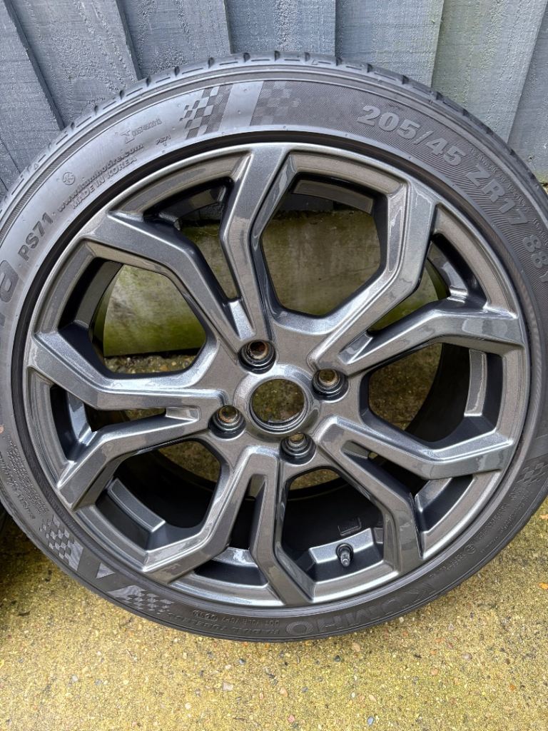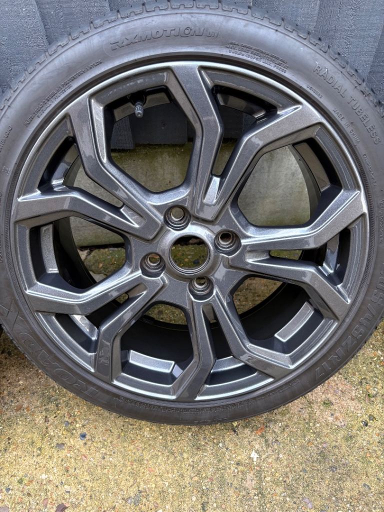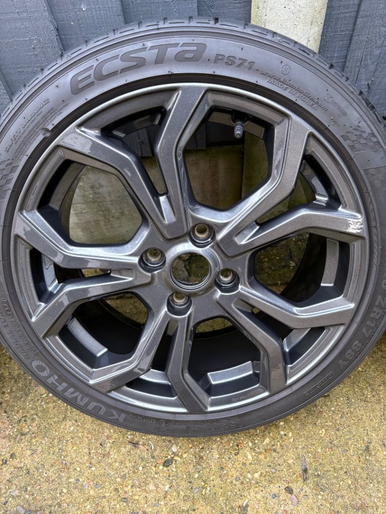 Set of 4 17” ST Line alloys, have recently been professionally refurbished in a dark grey. Excellent condition,no welds and are not buckled. All have 205/45/17 tyres fitted,2 are Kumho and 2are Road X all have decent tread as shown in pictures. All 4 have TPMS sensors fitted.
