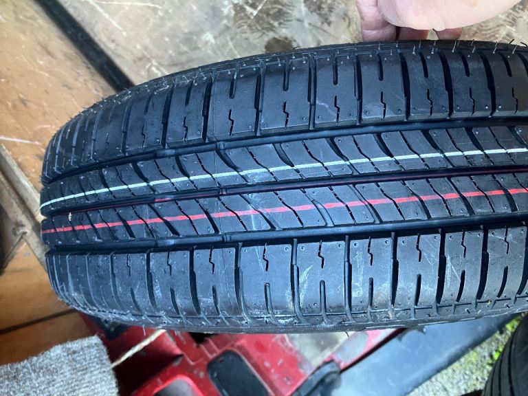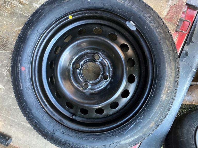 For sale unused 14” rim and tyre that have never seen the road, 165/60x14 Bridgestone fits a Nissan Micra or similar stud configuration as per photos £40