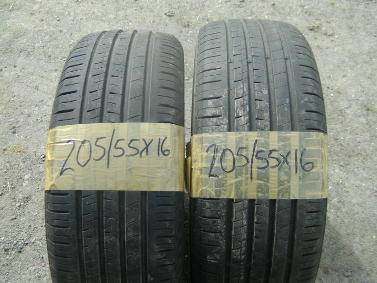 HI THERE I HAVE A PAIR OF BUDGET TYRES SIZE 205/55X16 THIS IS A GOOD QUALITY MAKE OF TYRE THAT NORMALLY RETAILS NEW FOR £60+ PER TYRE.ALL MY TYRES HAVE BEEN PUT ON RIMS AND PERSONALLY PRESSURE TESTED AND CHECKED FOR PUNCTURES, ANY DAMAGES,SCRAPES BULGES OR BLEMISHES ANY PUNCTURES HAVE BEEN PROFESSIONALLY REPAIRED WITH NO PROBLEMS THANKS FOR LOOKING
