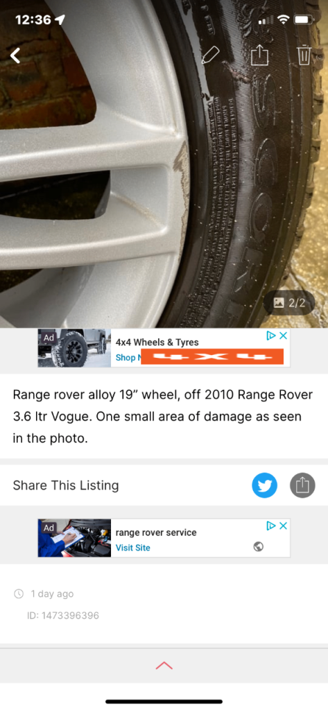 Range rover alloy 19” wheel, off 2010 Range Rover 3.6 ltr Vogue. One small area of damage as seen in the photo.