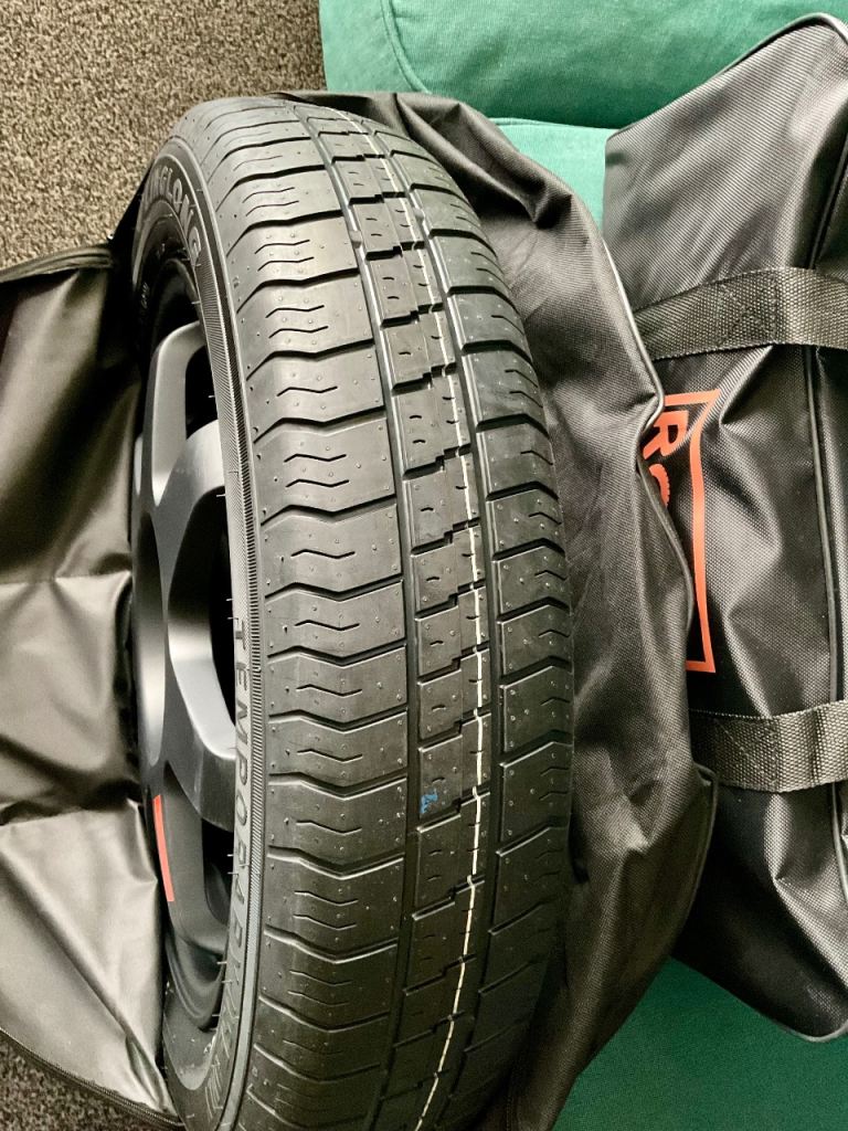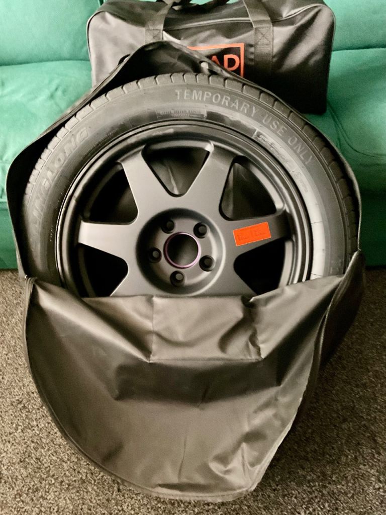 Brand new emergency spare tyre and kit. Photos show what is inside the kit bag, unused tyre and details on the wheel on both sides for reference. Purchased for Renault Captur 2022.