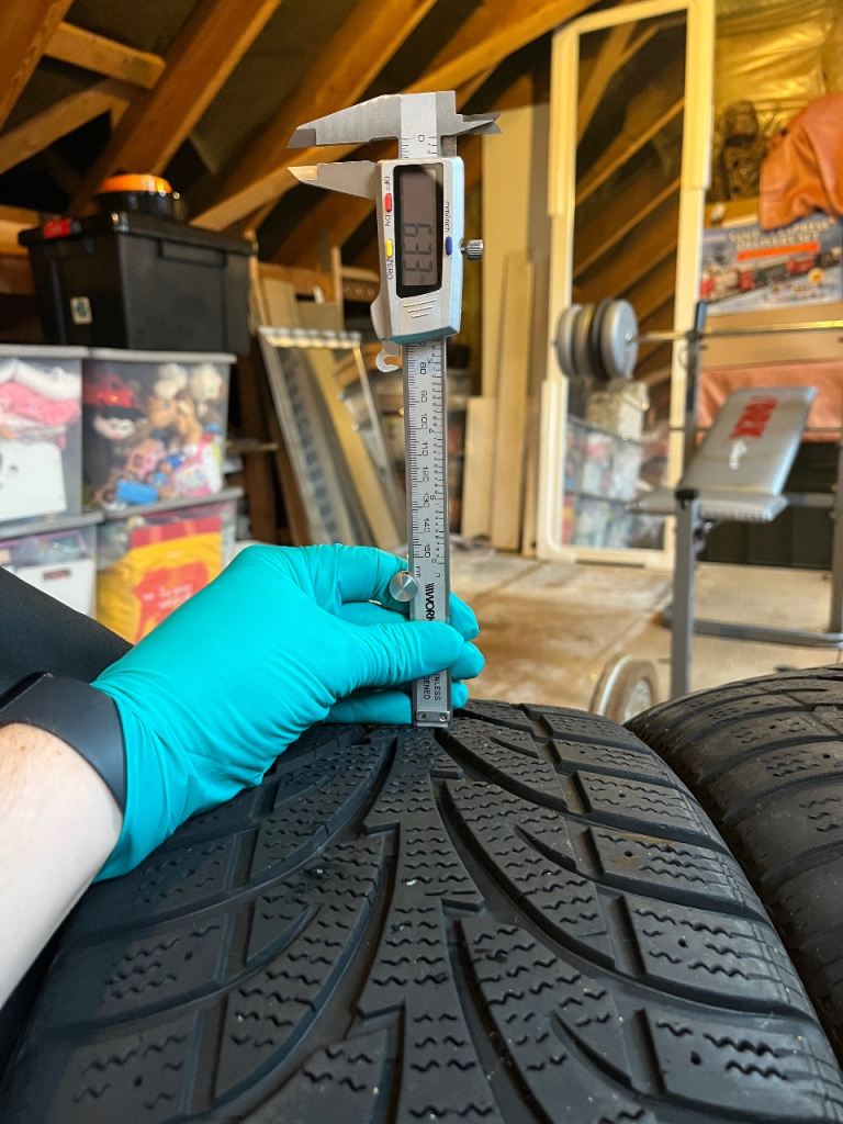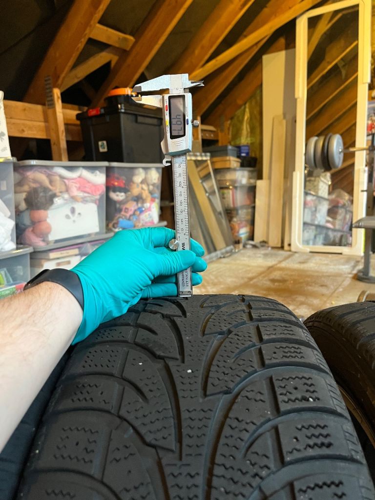 Tread depths are approximately 6mm, 5mm and x2 3mm. One is tyre is worn onto the markers on inner shoulder. Tyres are free from any damage.