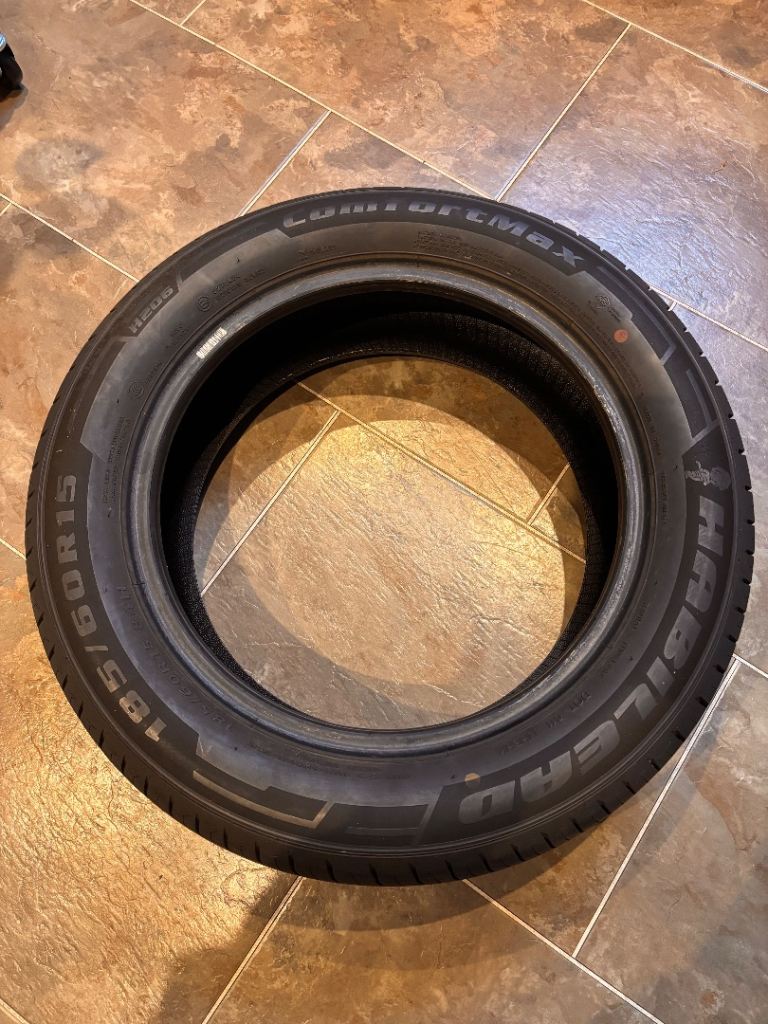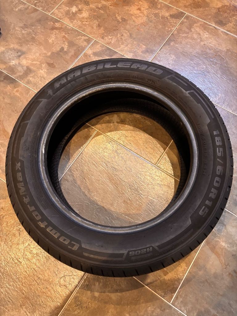 Spare tyre for vehicle we no longer have. HABILEAD 185/60 R15 84H. AI description- Habilead tyres are an affordable, budget-friendly brand from China's Shandong Huasheng Rubber Company, known for providing everyday reliability, comfort, and decent grip for passenger cars and light commercial vehicles, with popular models like the Comfortmax for smooth rides and Sportmax for sportier performance, offering good value for money. They are manufactured using advanced equipment and aim for quality construction for durability, fuel economy, and stable driving in various conditions, targeting drivers seeking cost-effective yet dependable tyres.
