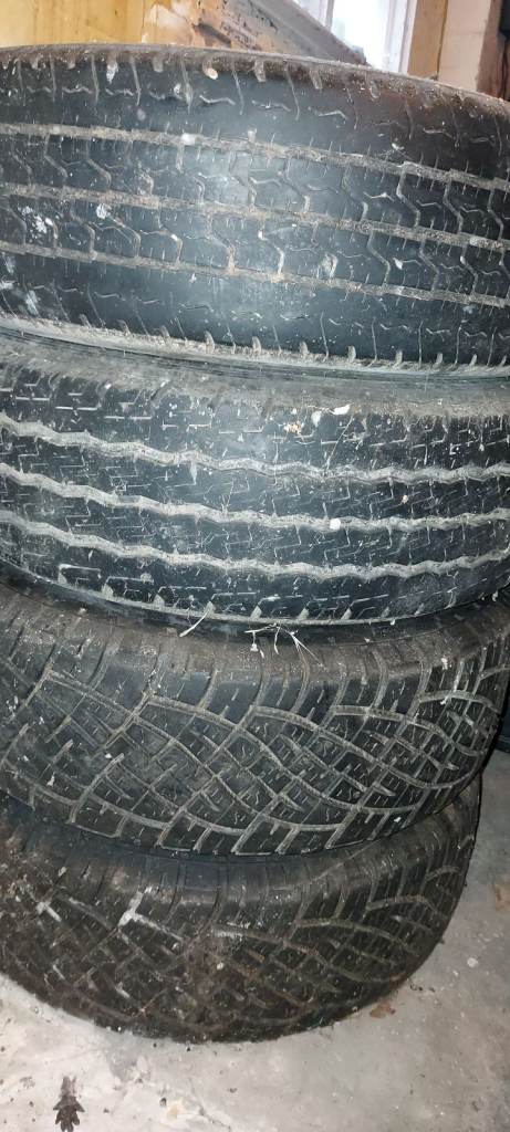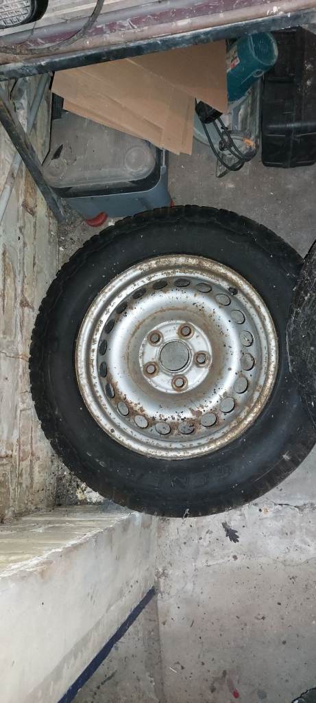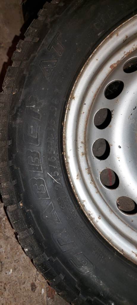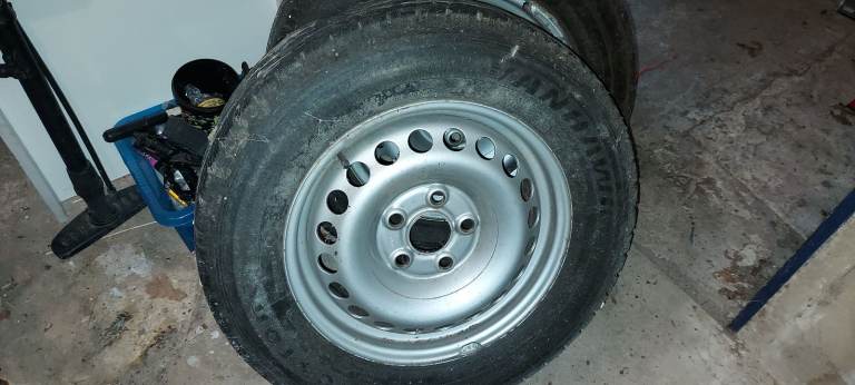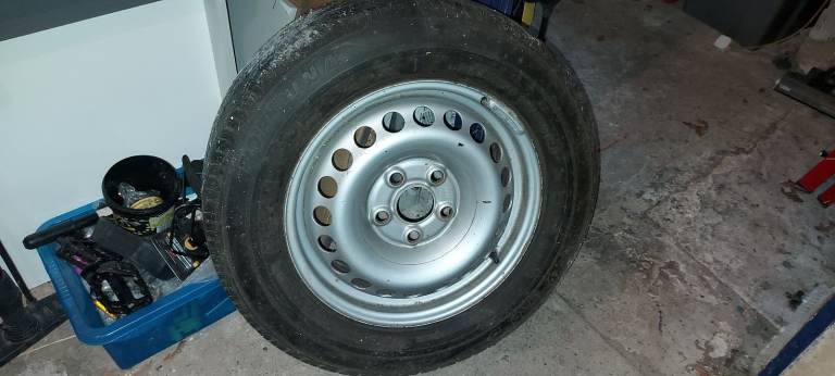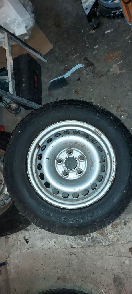 4 X steel radial wheels from VW T5, tyres in good condition, 2 of the tyres are 'GRABBER'S', 4 VW centre hub caps.