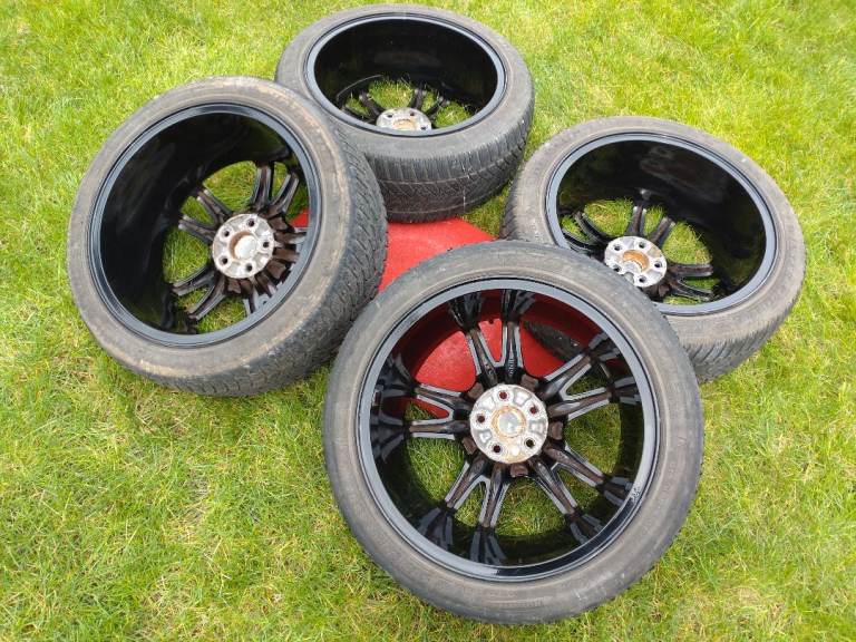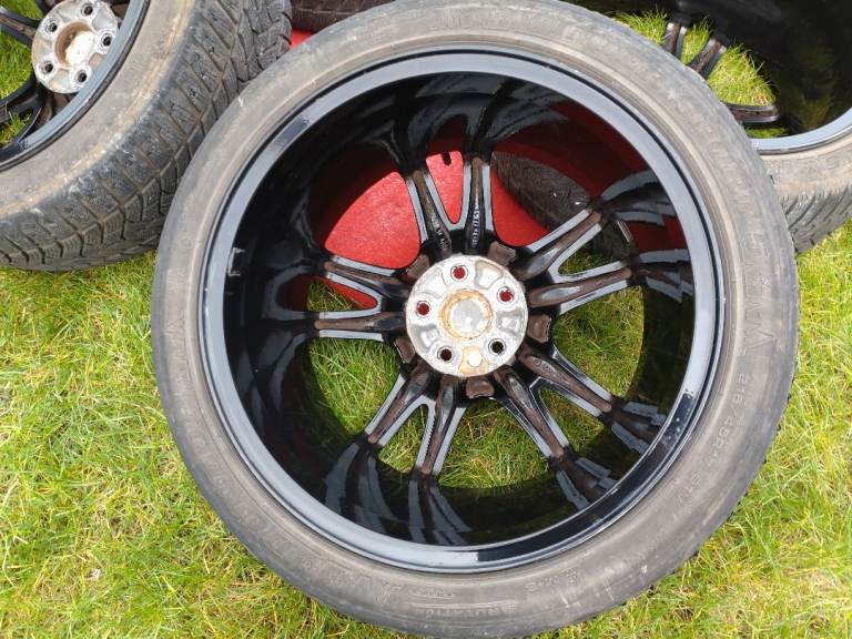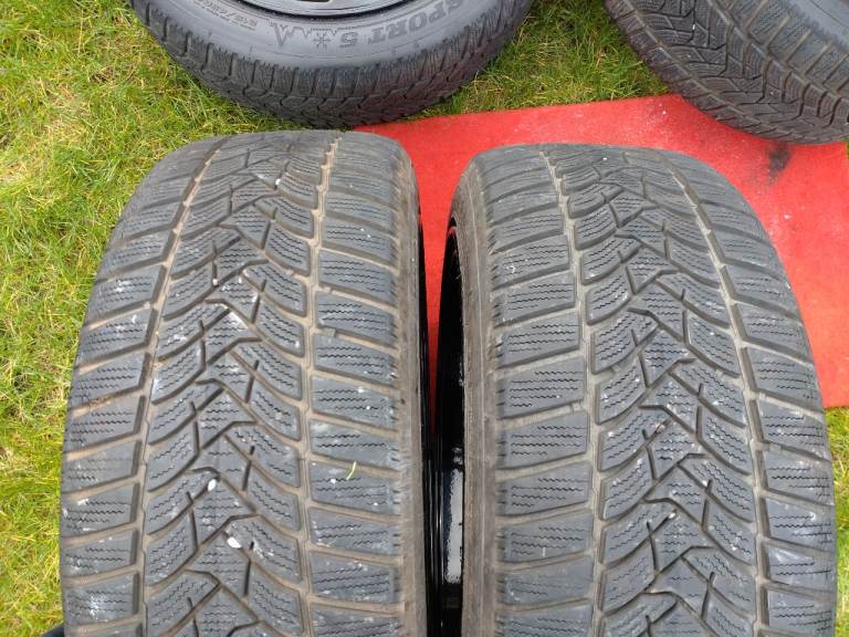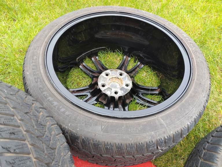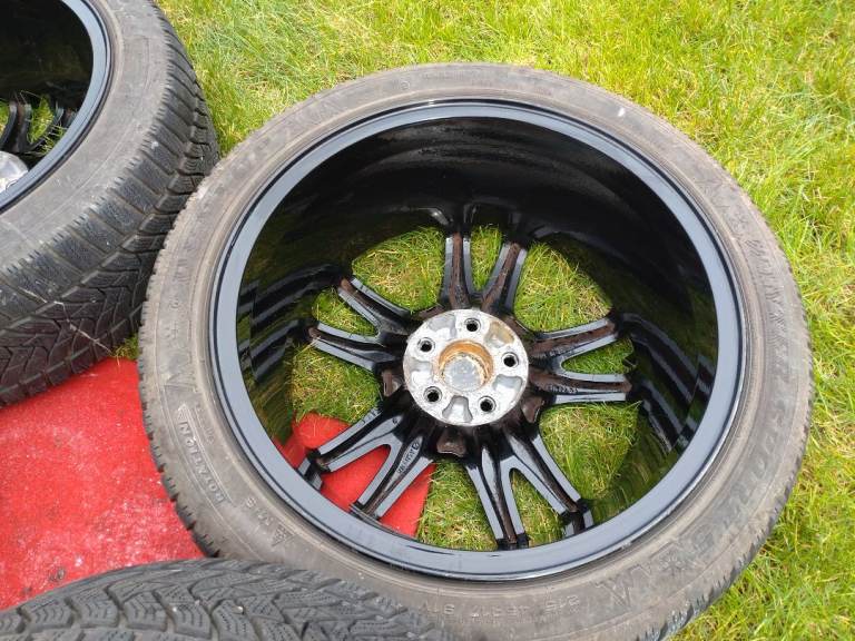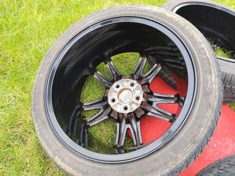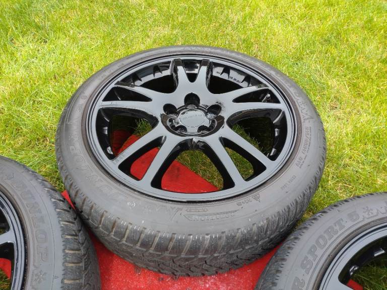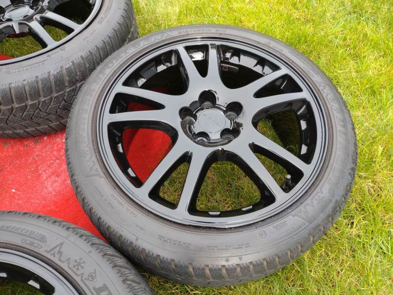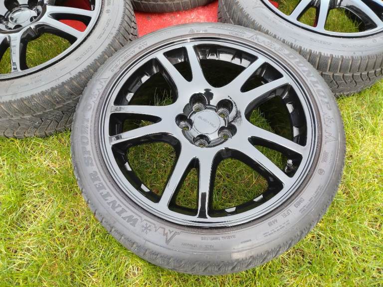 Subaru Impreza WRX STI wheels 17x8JJ, 5×100, ET53 powder coated in gloss black in very good condition, comes with 4 matching 215/45/17 Dunlop winter sport 5 tyres also in good condition.