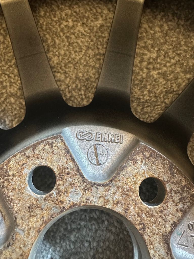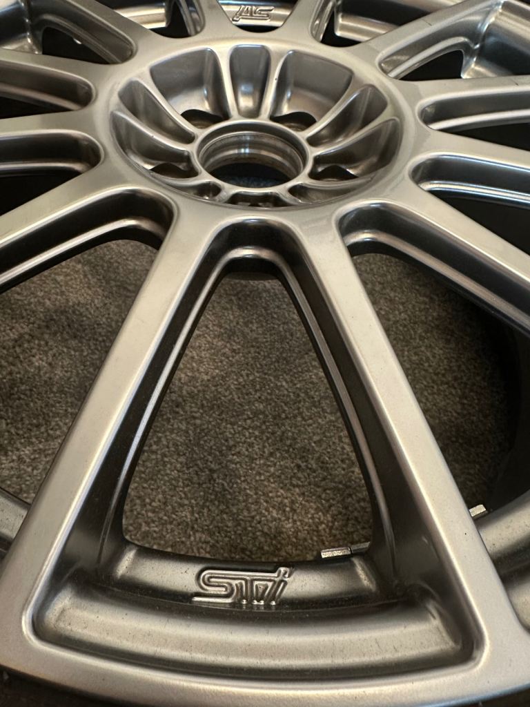 A single (kept as spare) Subaru Legacy Tuned by STI Enkei wheel.