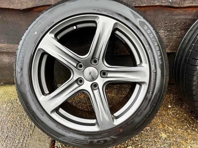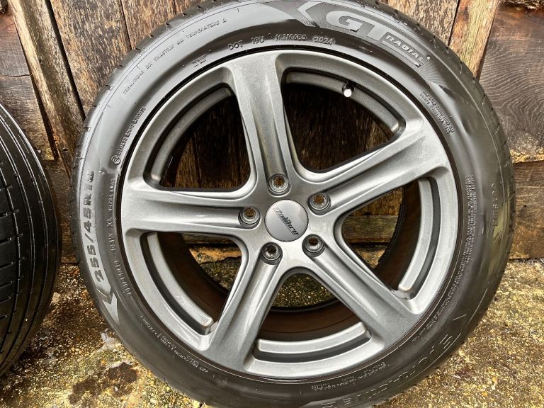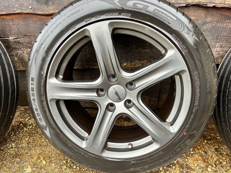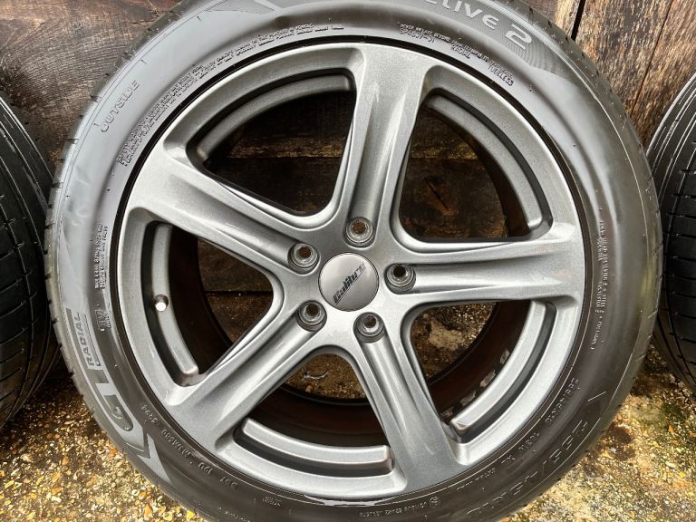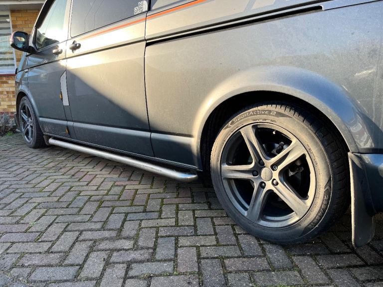 4 Calibre 18x8 alloy wheels for vw T6. Very good condition no kerbing damage,tyres are a year old with plenty of tread left. Come with full set of bolts including locking nuts and plastic covers. Ready to fit straight onto your T5 T6. Load rated at 1100kg.