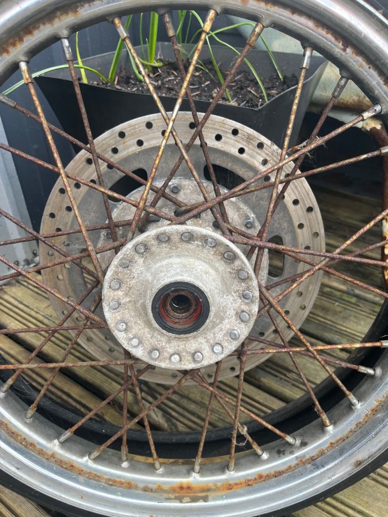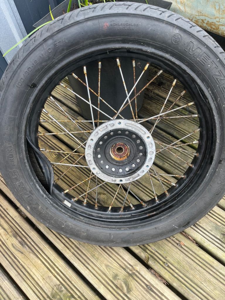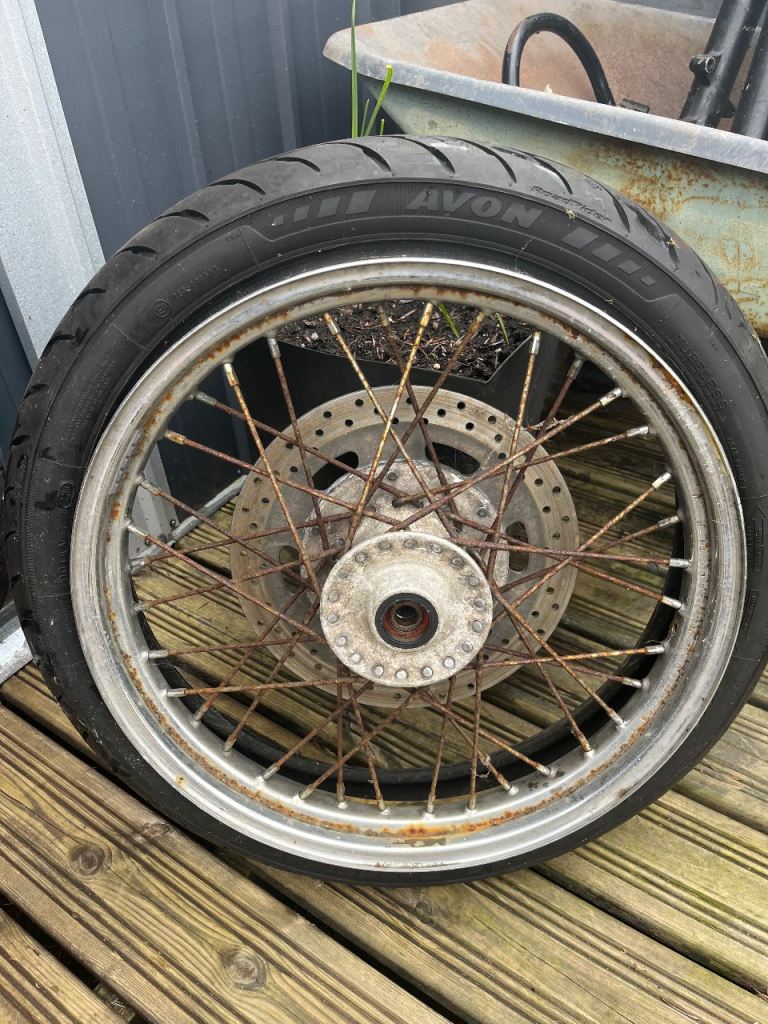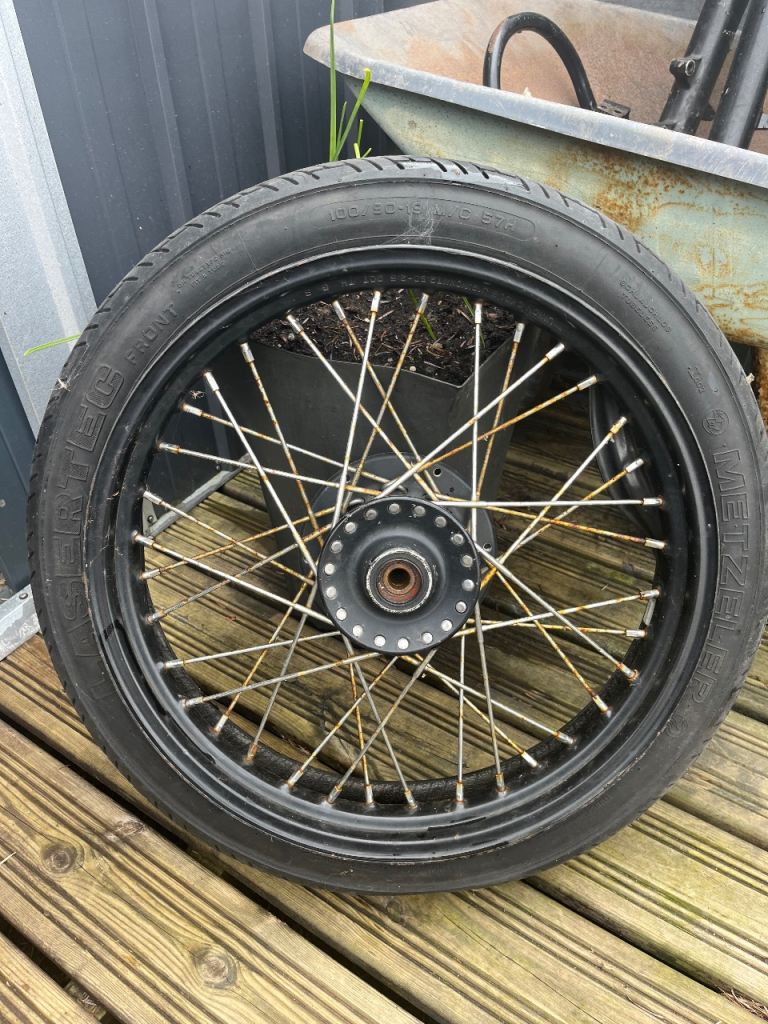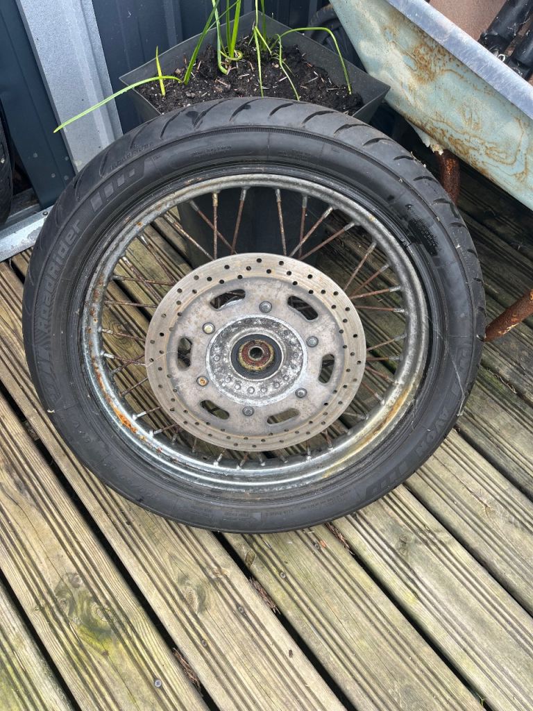 1 chrome triumph spoked front wheel. Comes with front disc and tyre. Some age related marks but no damage. Again good tread. Open to sensible offers. £60