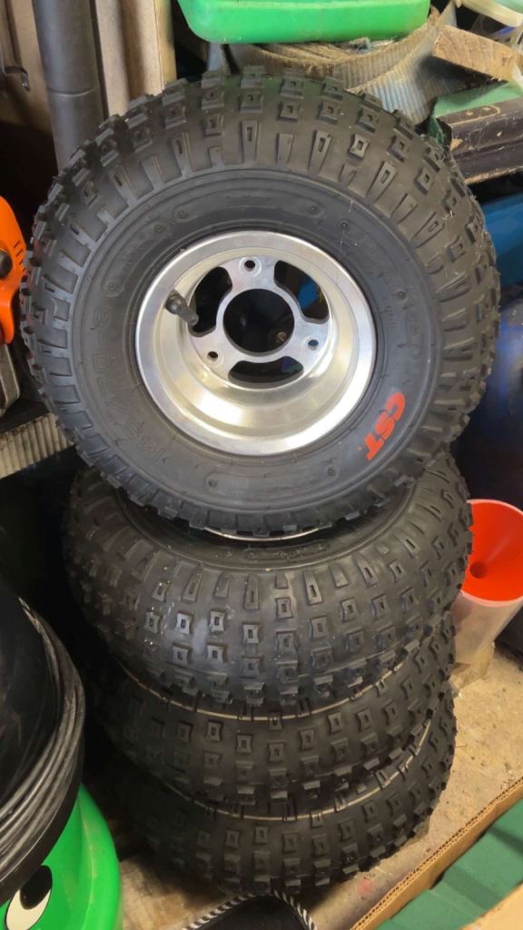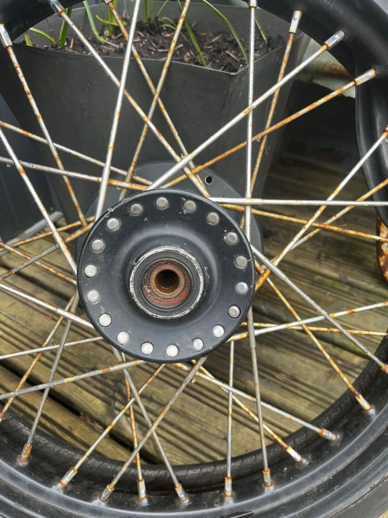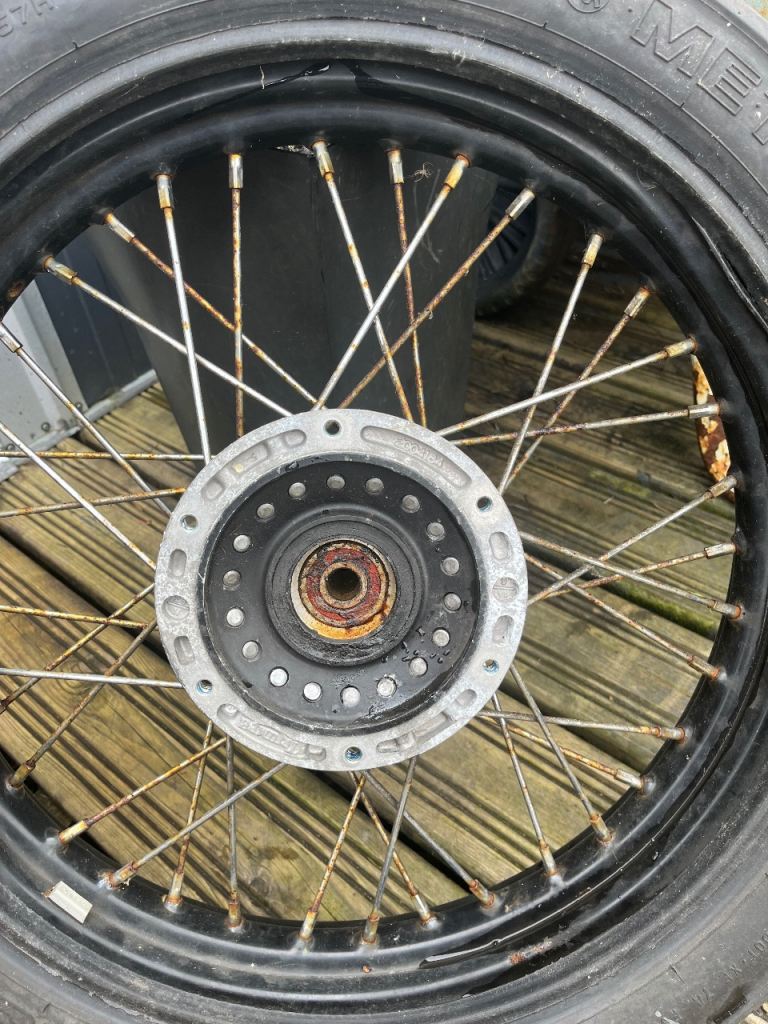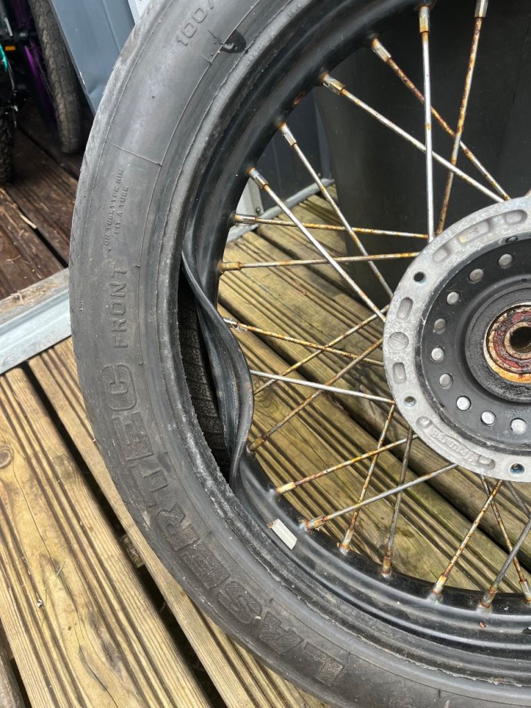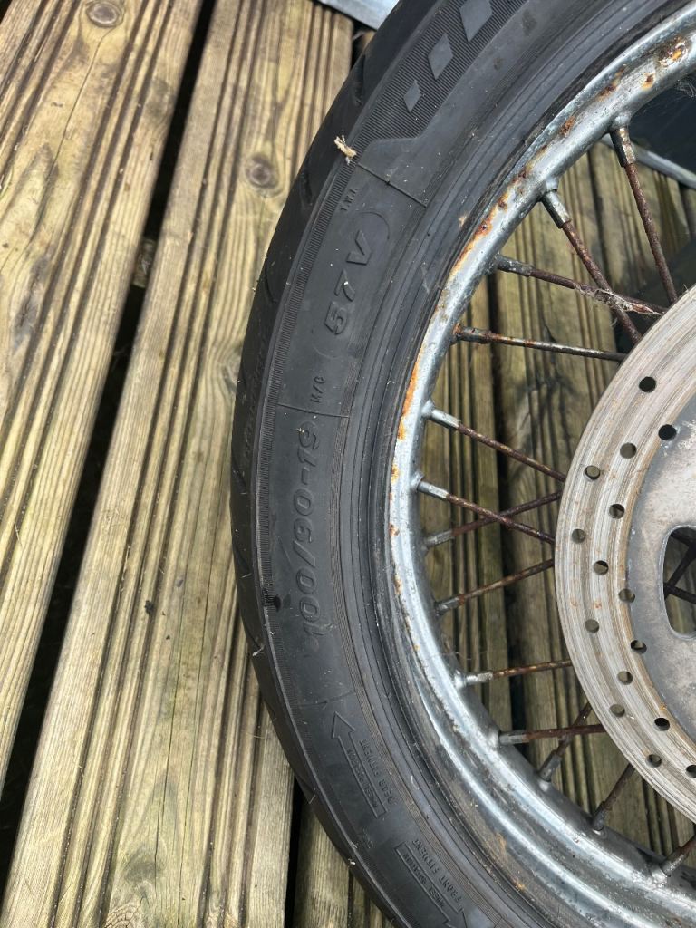 1 chrome triumph spoked front wheel. Comes with front disc and tyre. Some age related marks but no damage. Again good tread. Open to sensible offers. £60
