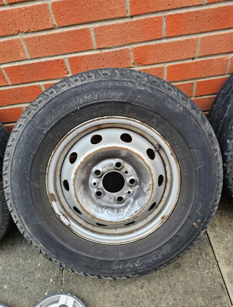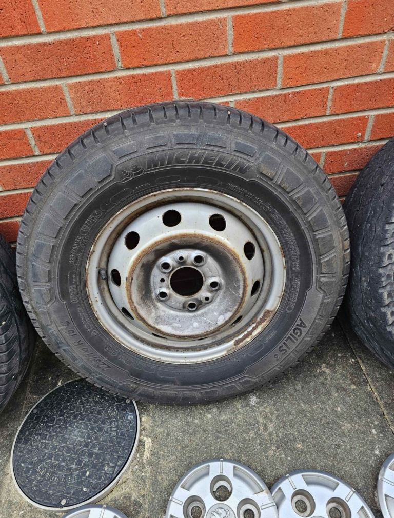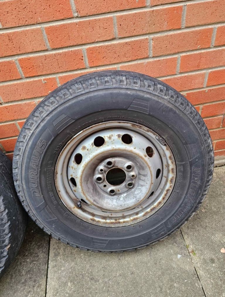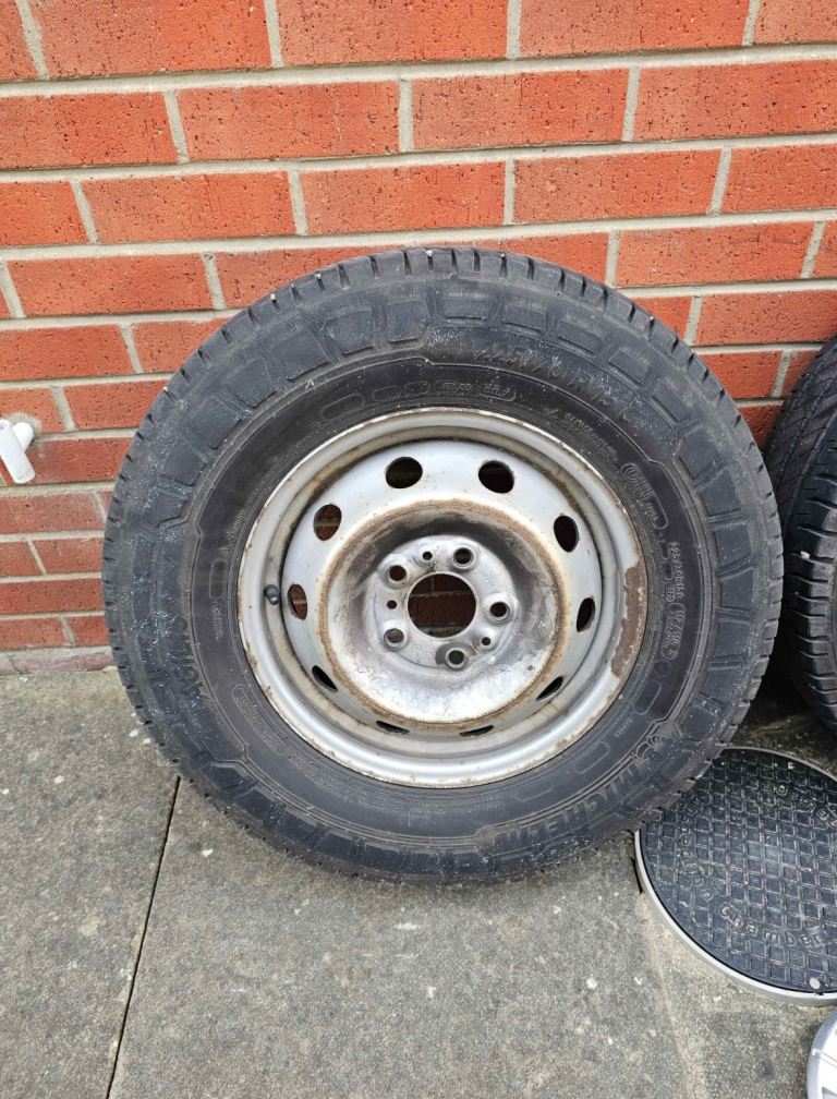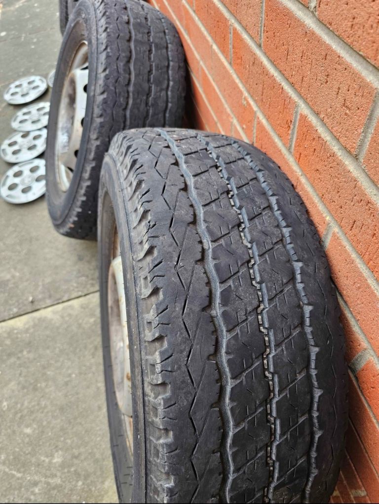 Set of 4 steel rims with tyres to fit Peugeot boxer, Citroen Relay, Fiat Ducato or Vauxhall movano come with 4 good tyres with plenty of life left in them. Reason for sale I have swapped for 4x4 alloys.