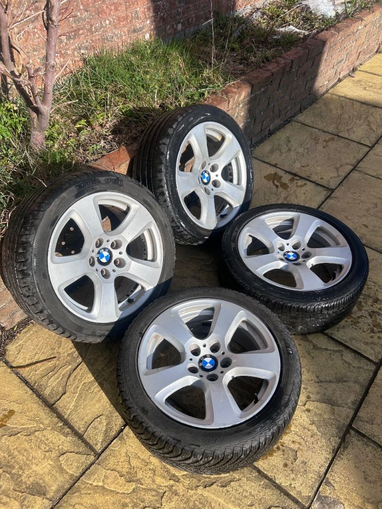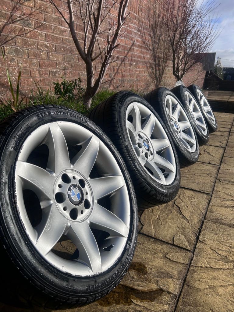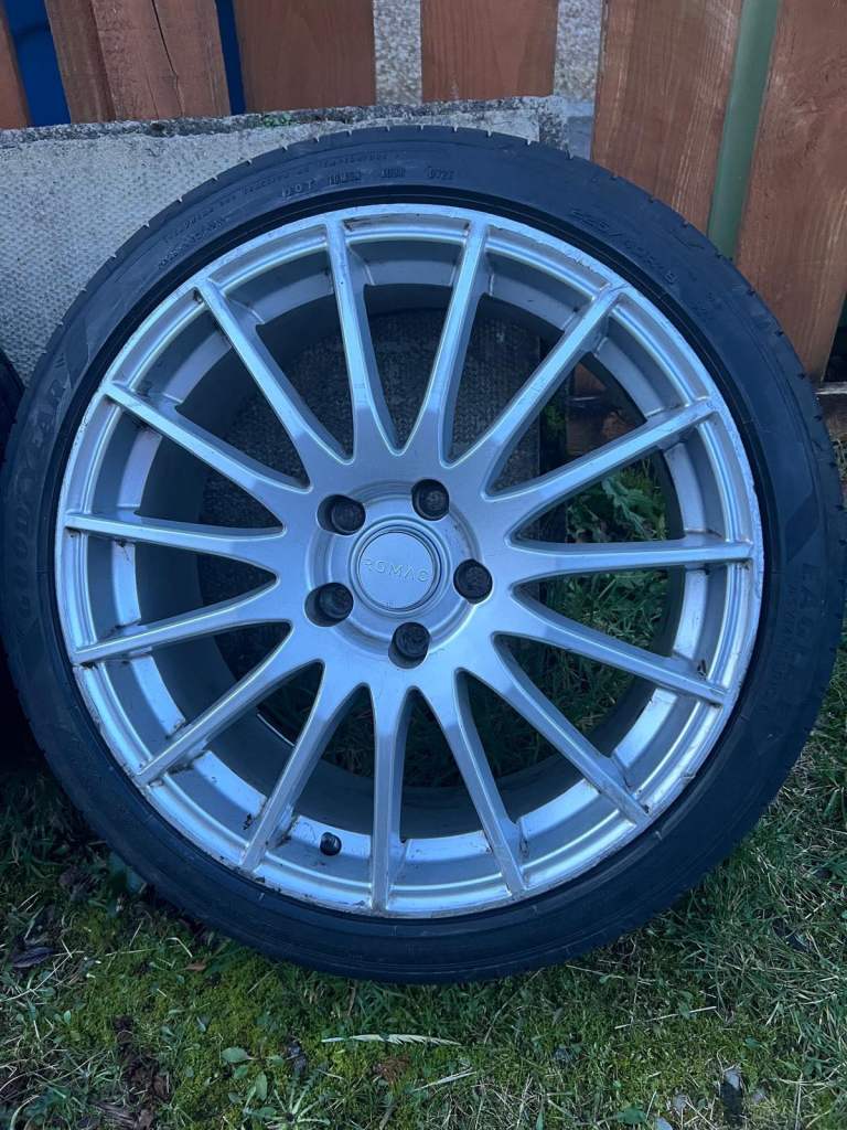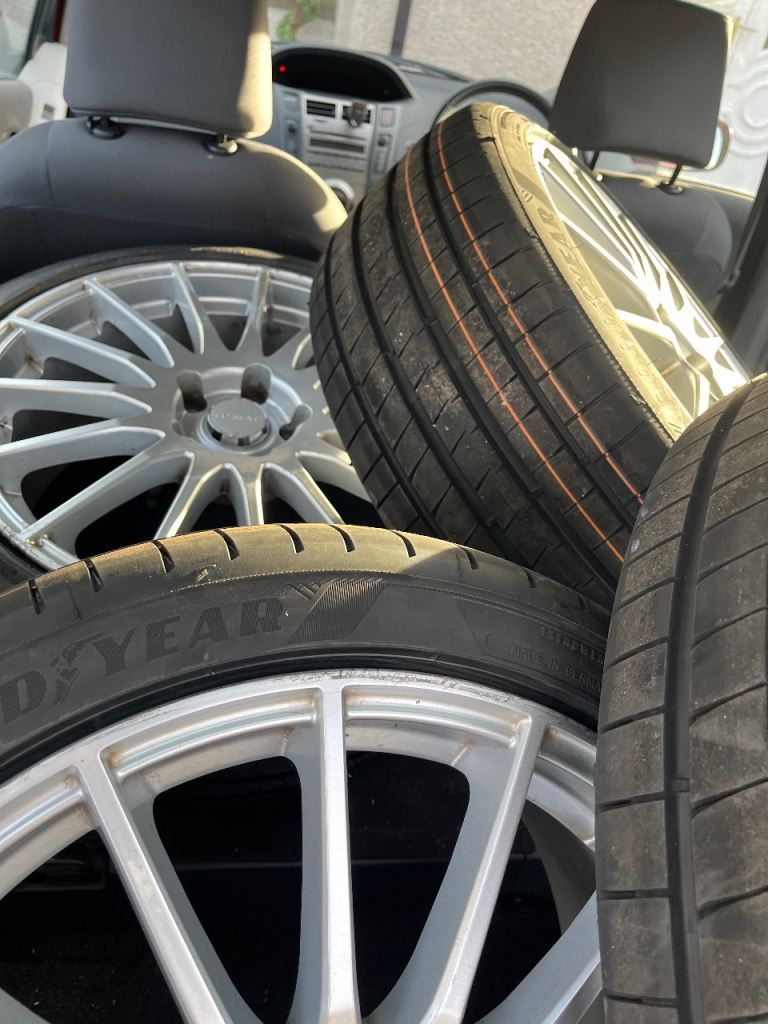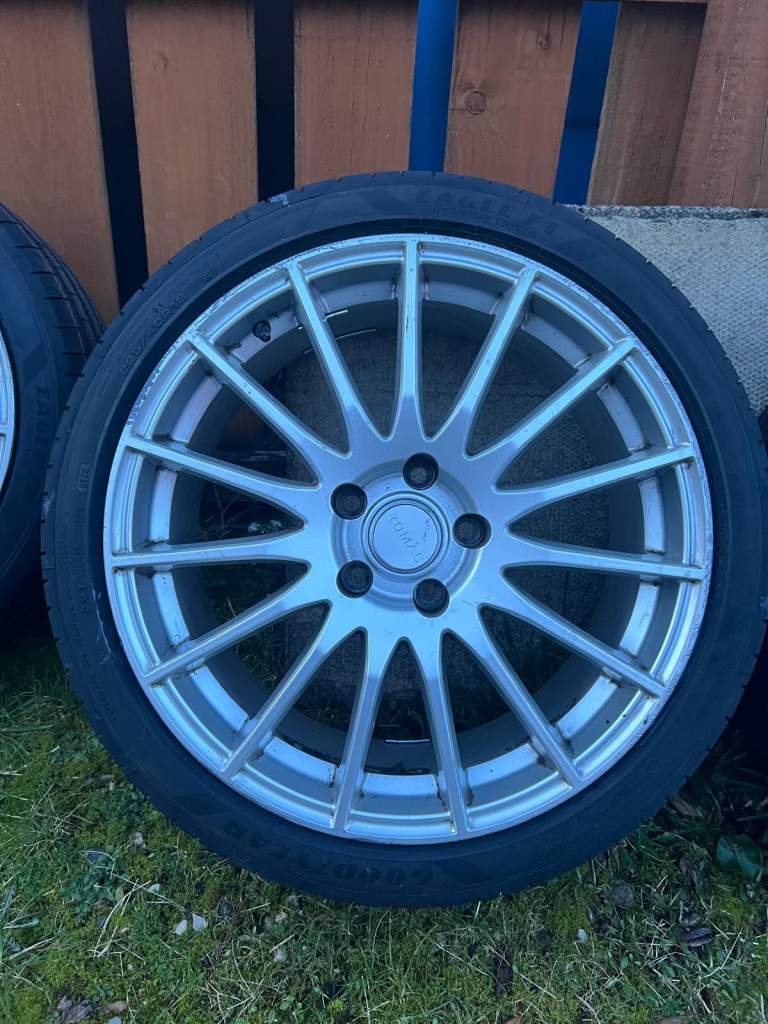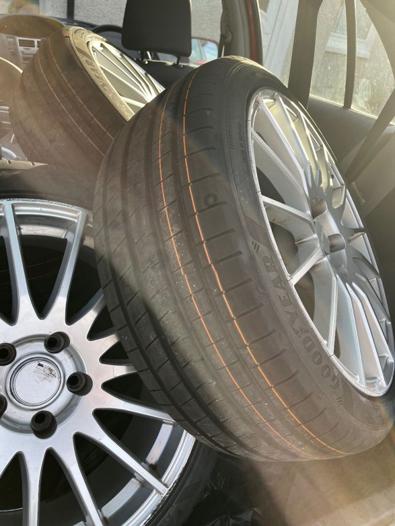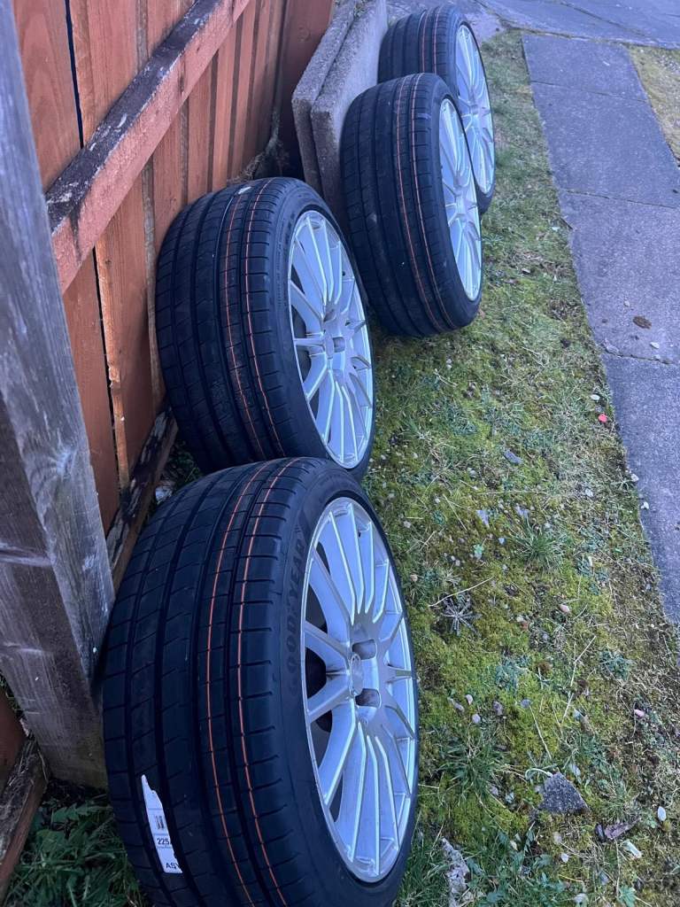 Hi I have a set of alloy wheels they have a set of Goodyear f1 tyres they are brand new the size is 225/40/18 if you’re interested call me