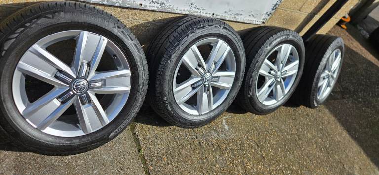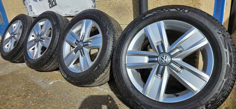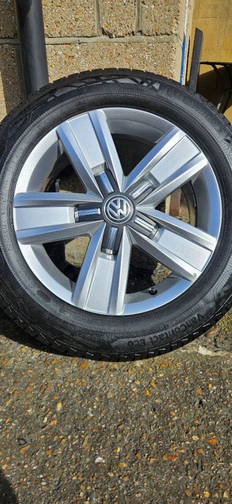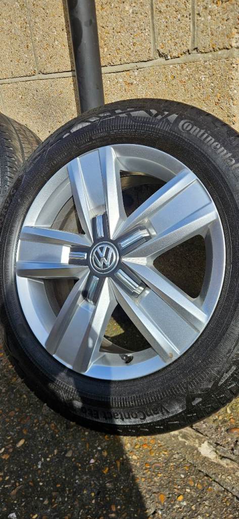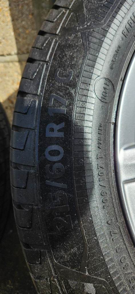 Volkwagen T5/T6.1 17" Davenport Alloy Wheels in immaculate condition no marks or kerb rash on the fronts ( THESE ARE HARD TO FIND IN THIS CONDITION ) Matching set of 215/60/17 Continental van Tyres with all around 7+mm Tread remaining ( New Tyres come with 8mm ) and no puncture repairs or sidewall damage, Tyre Dot code is 2024.