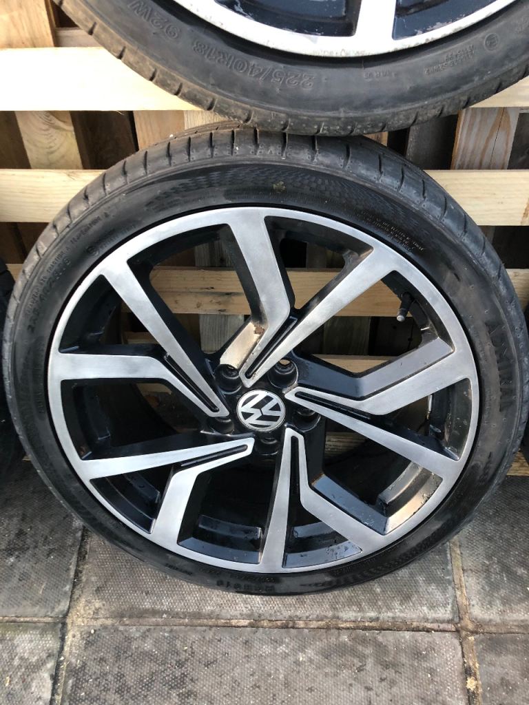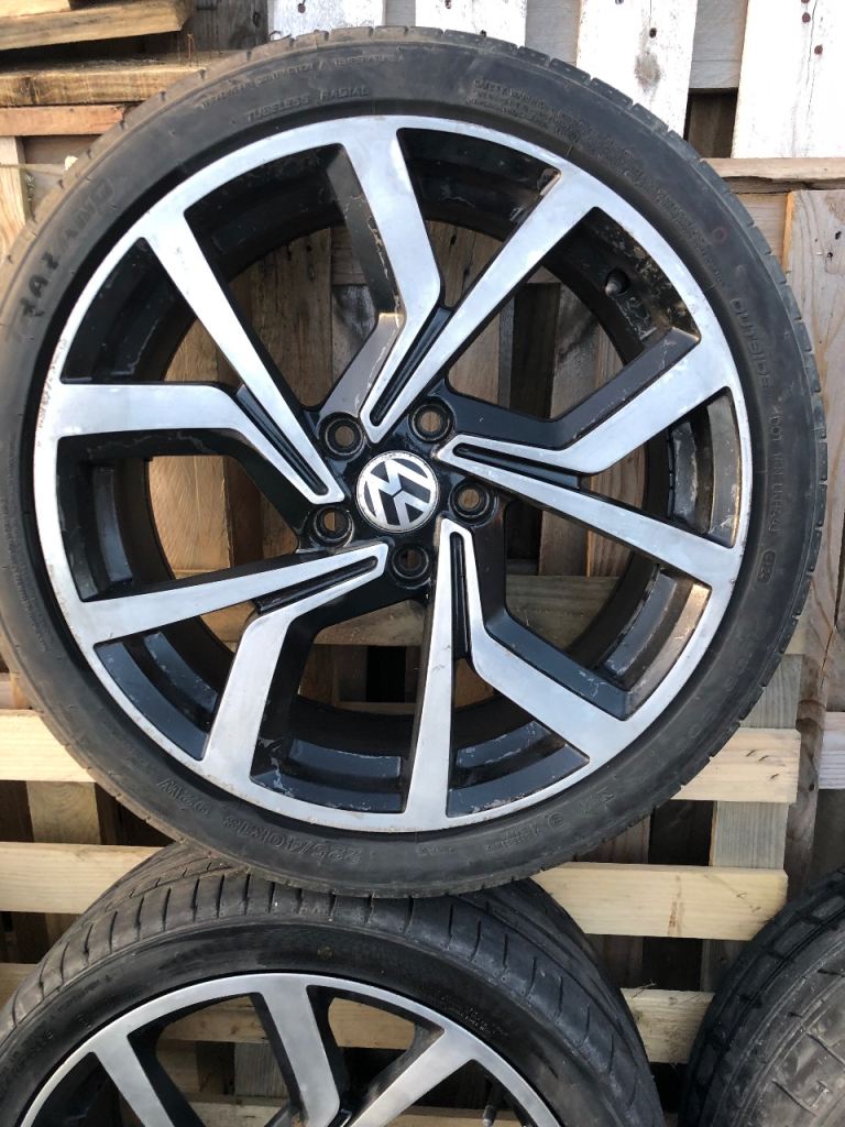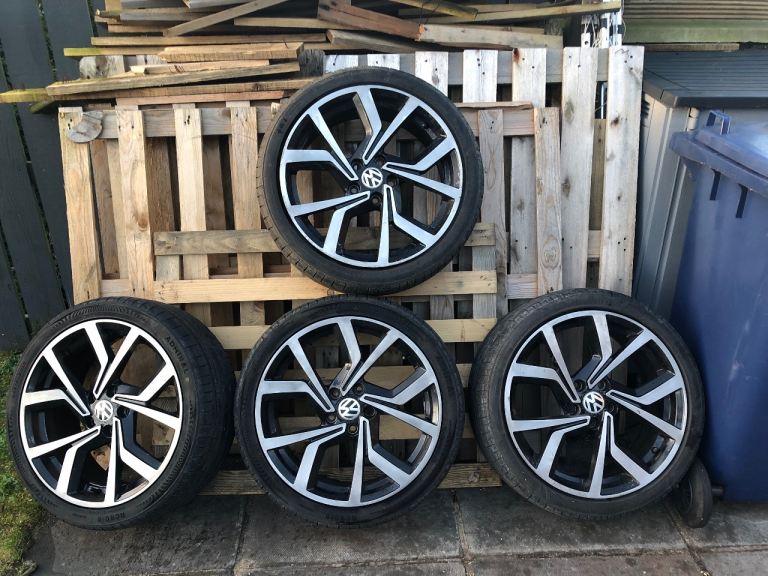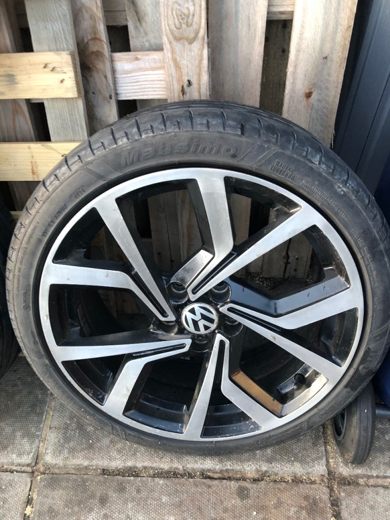For sale Vw golf club alloys 18 inch 5x112 2 good tyres other 2 50% tread left no buckles cracks or welds removed form mk7 golf looking £375 ovno plz no best price come with center caps good set of winter wheels for someone little bit of lacker peal reflected in the price . Wheels can b viewed in portadown