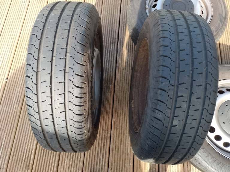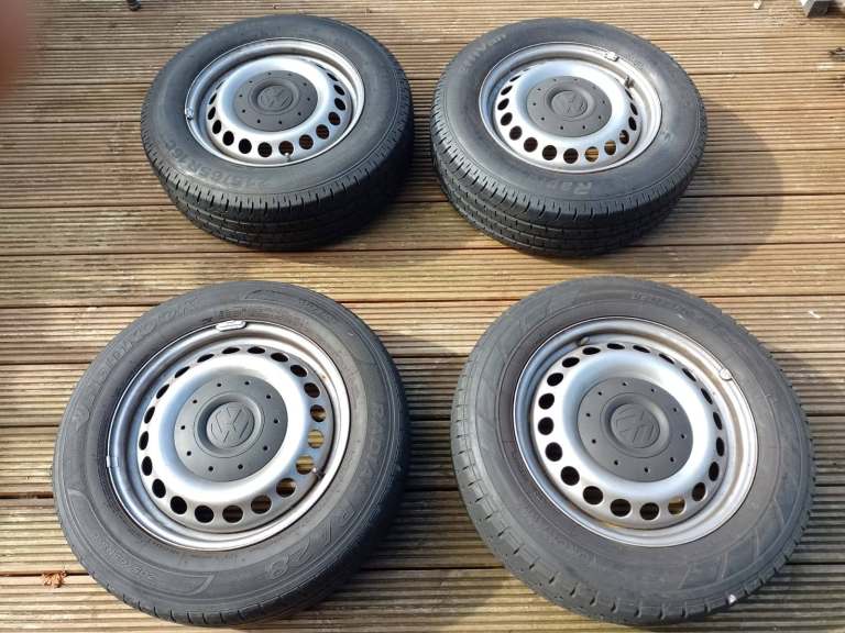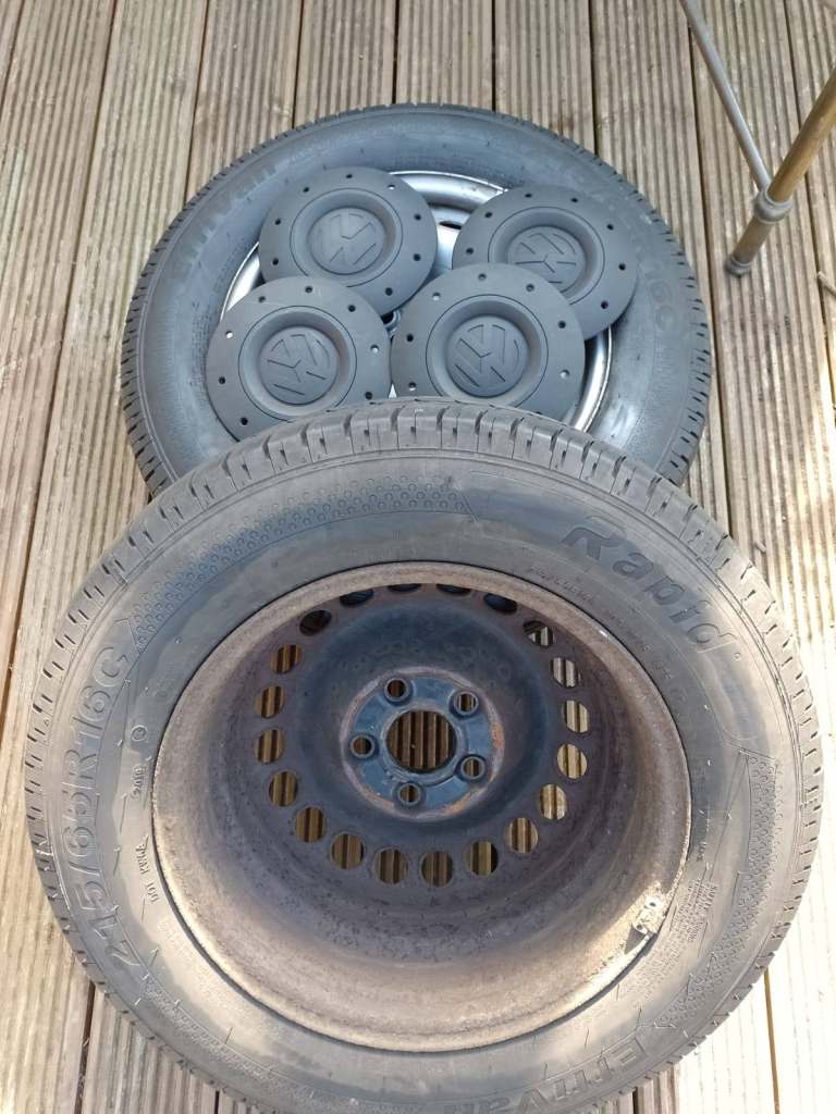 Good tread on 3 of the tyres. 4 steelies available with vw plastic hubs
