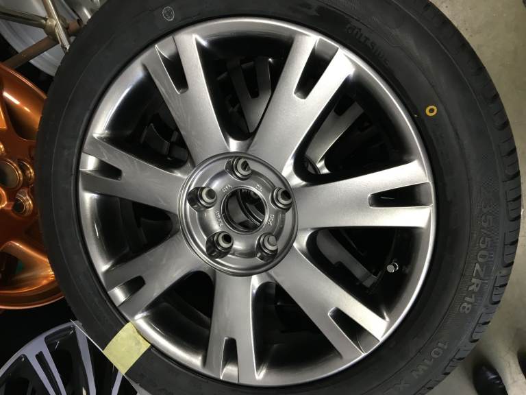 Fully refurbished, smoked grey inside chrome metallic outside, as brand NEW, with brand NEW tyres 235/50ZR18 101W, Complete with center caps refurbed, Balanced ready to go, from a VW Touareg MK1, also have chrome valves + caps. They fit perfectly onto any VW T5 or T6 Vans.