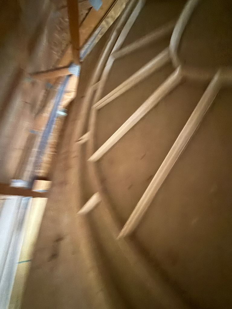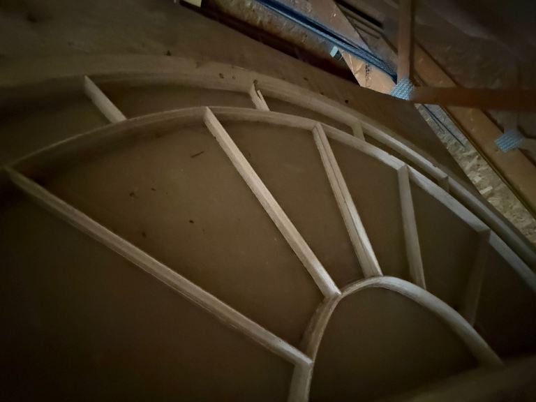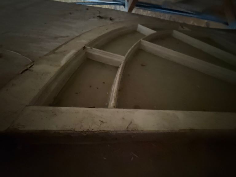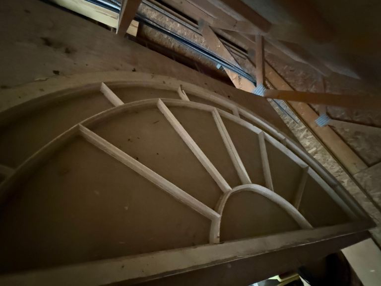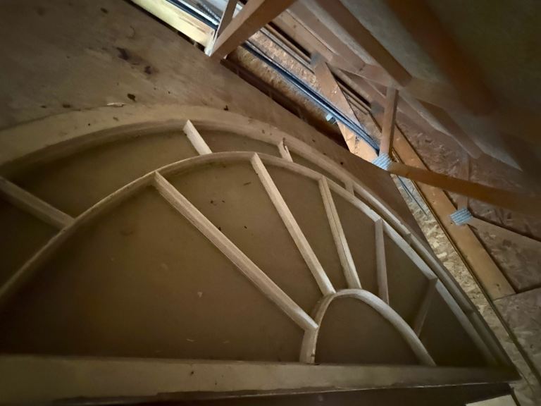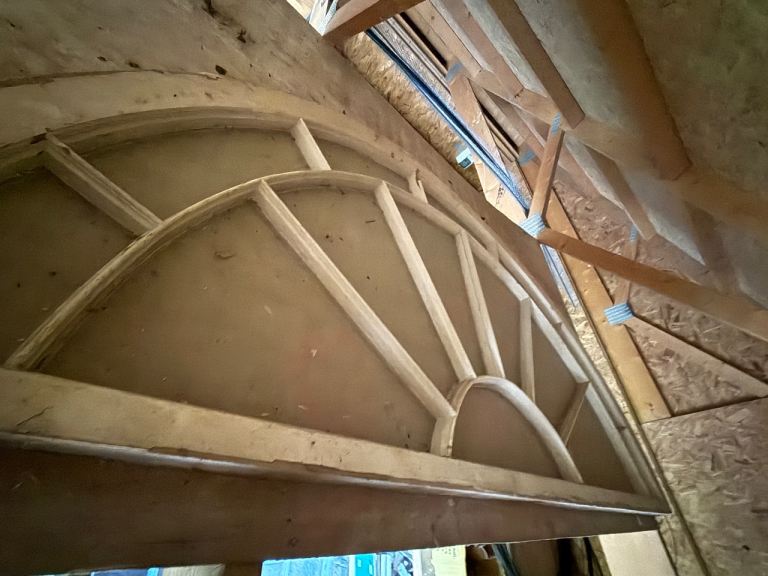 A large reclaimed semi-circular (fanlight) wooden timber frame window with traditional radial glazing bars and curved frame, approximately 1.6 m wide.