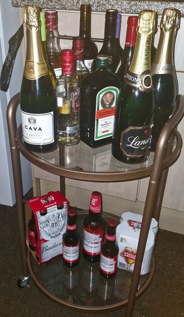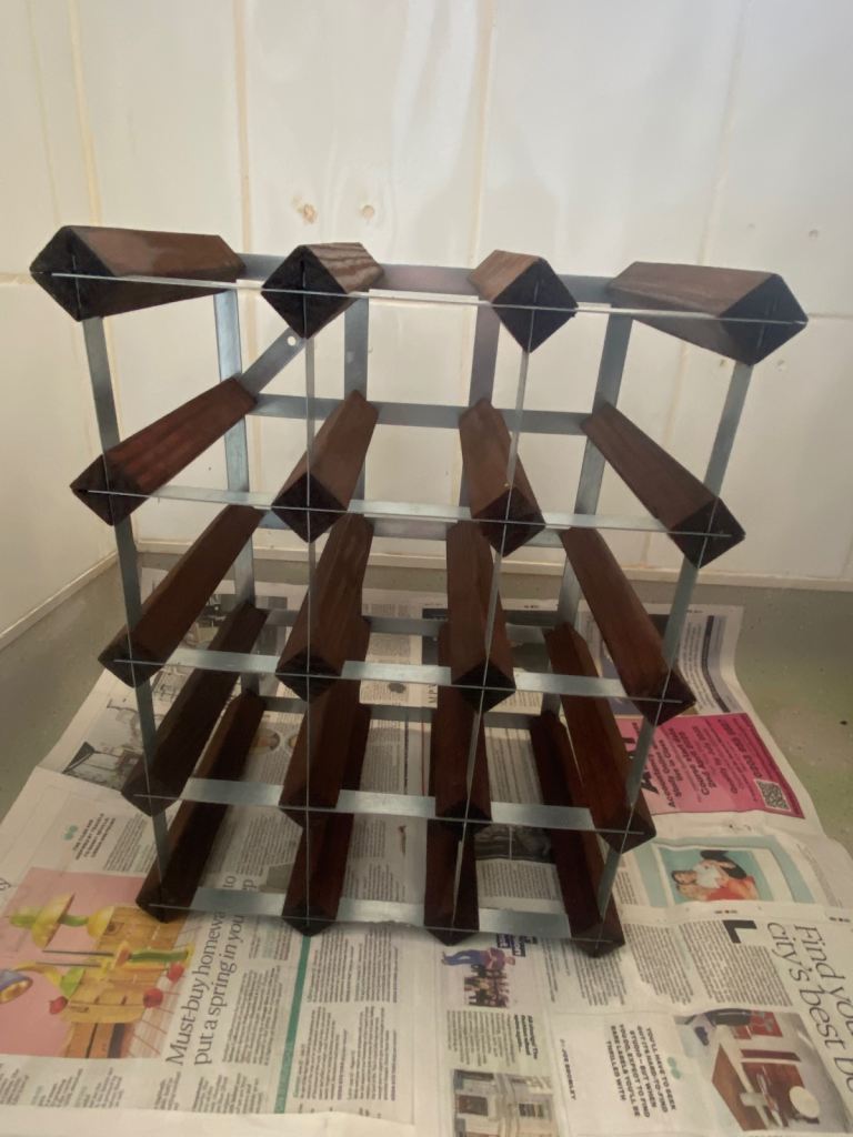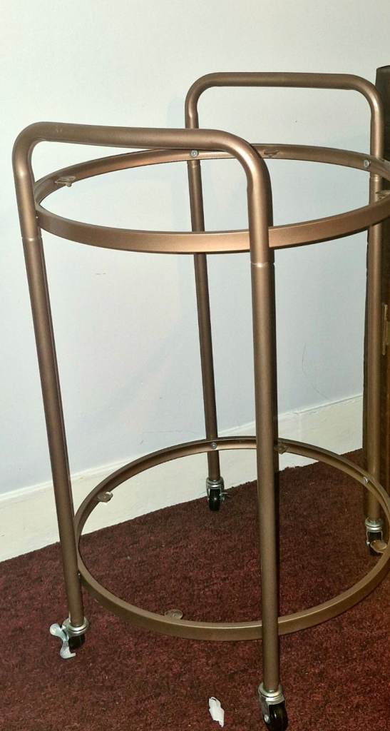 2 Glass shelves encased in bronze coloured steel , with handle on either side.