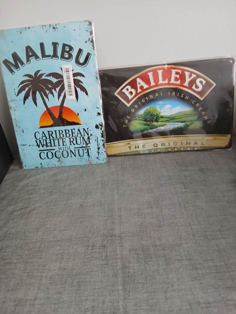 2 signs 30x 20 cm. Metal feel, like tin. Can be drilled or stuck on the bar wall