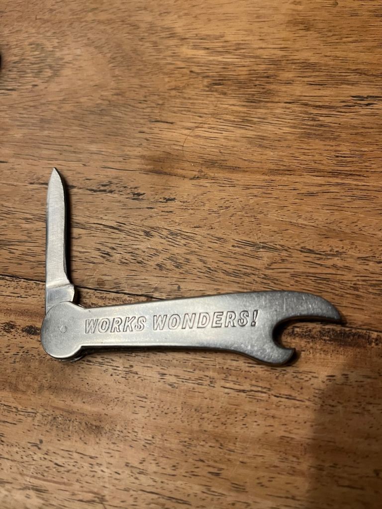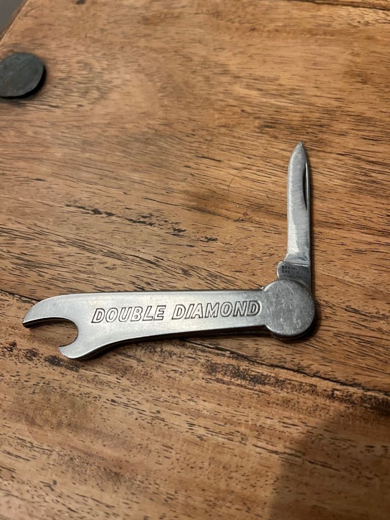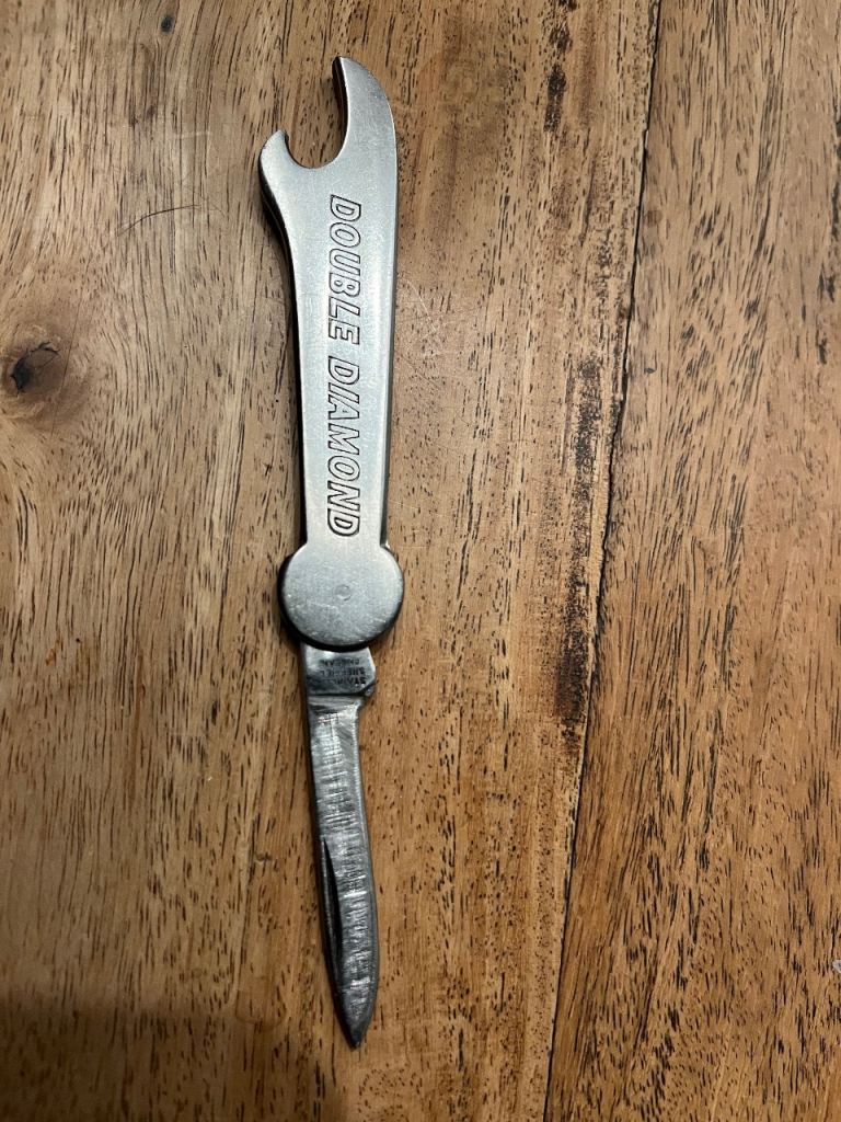1970s bottle opener with small 6cm knife blade, Double Diamond Works Wonders embossed on sides. Made in Sheffield.
