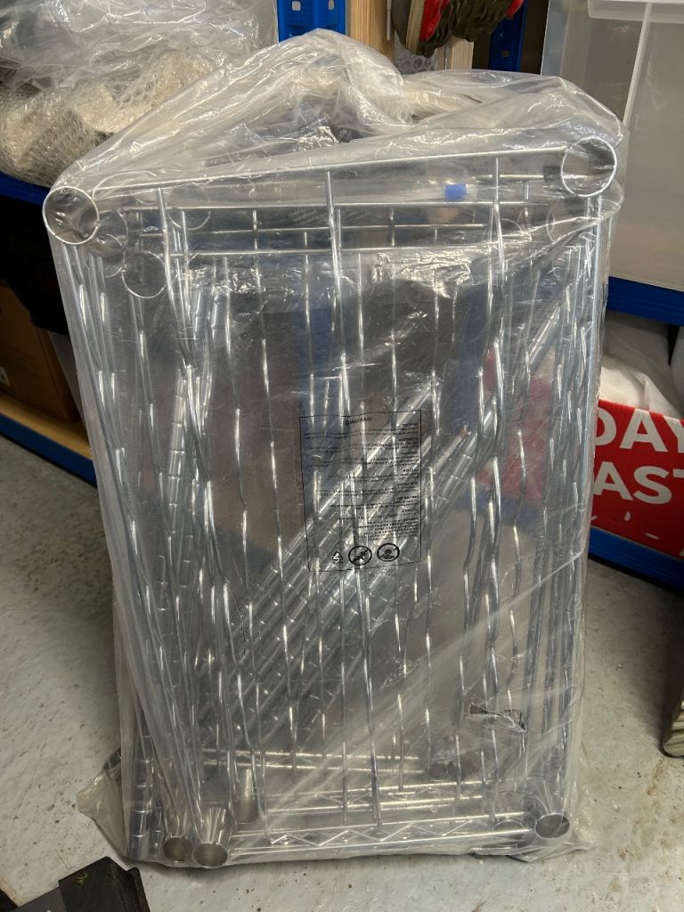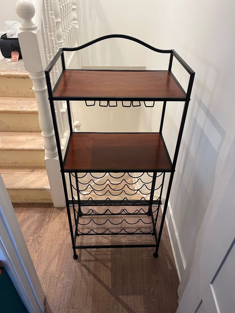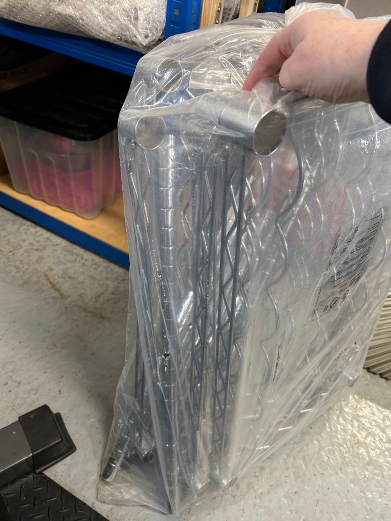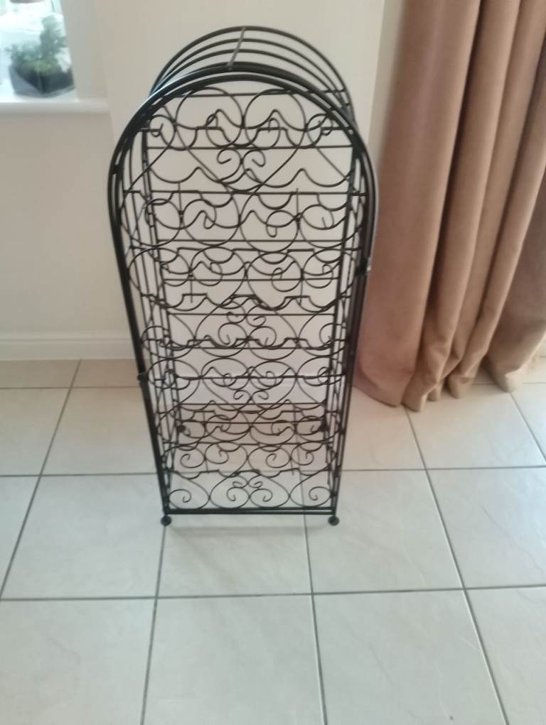 Large Metal wine rack, used but in excellent condition and currently disassembled and stored in its original plastic packaging.