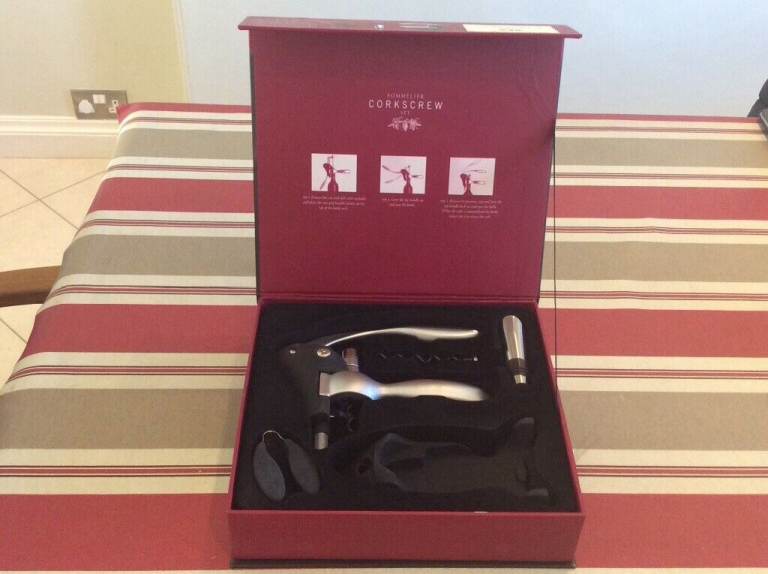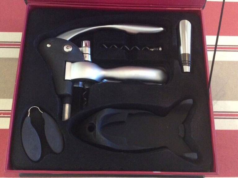 Set includes wine pourer with integral stopper, stand, foil cutter and extra worm