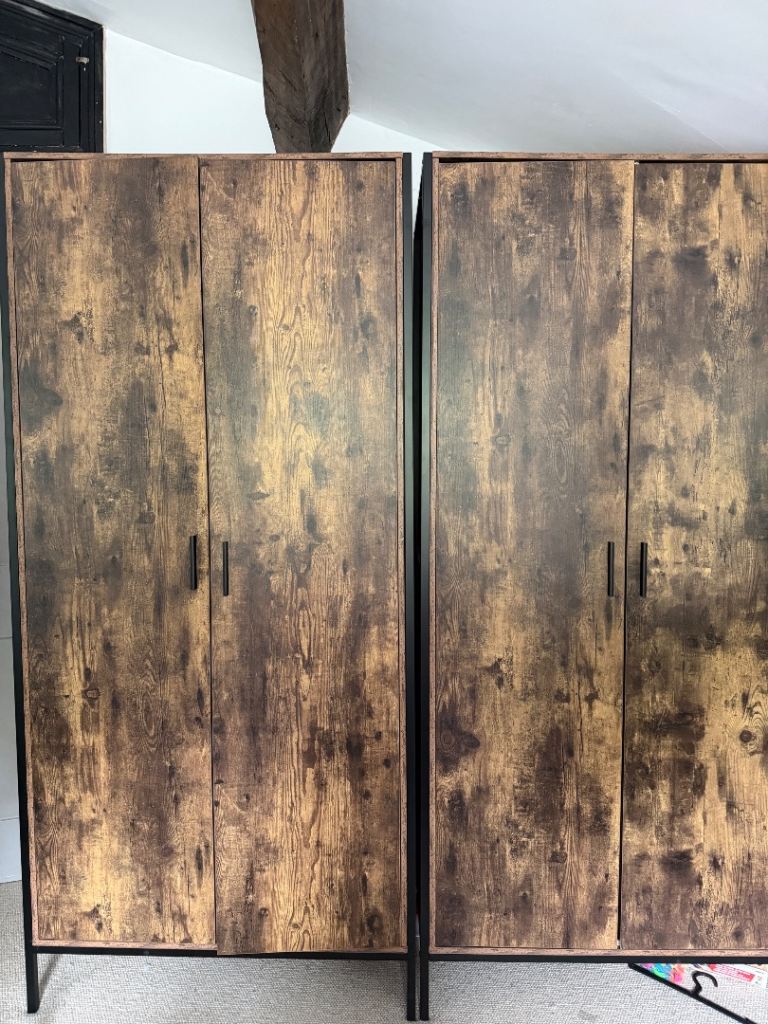 Two wardrobes, chest of drawers and double bed, no mattress.