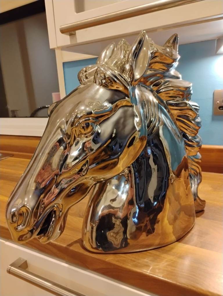 Stunning metal Horses Head finished in bright silver. 55cm wide X 43cm high No damages whatsoever.An amazing stand alone piece of home decor. ♥️. Pick up only please. It's big xx
