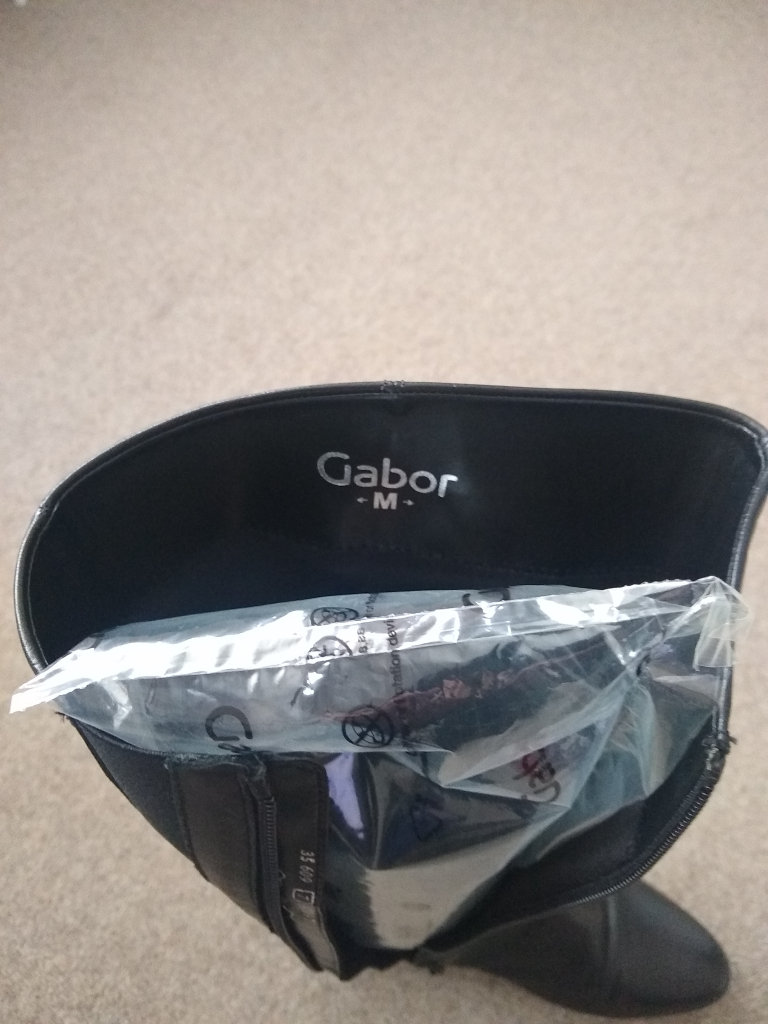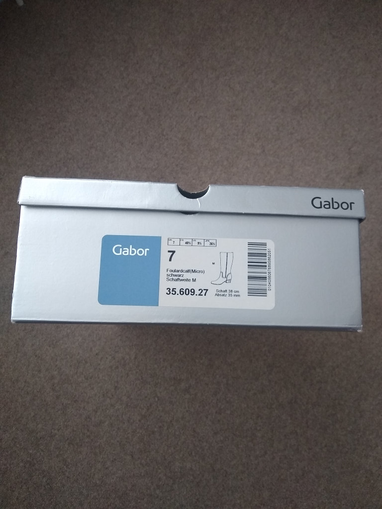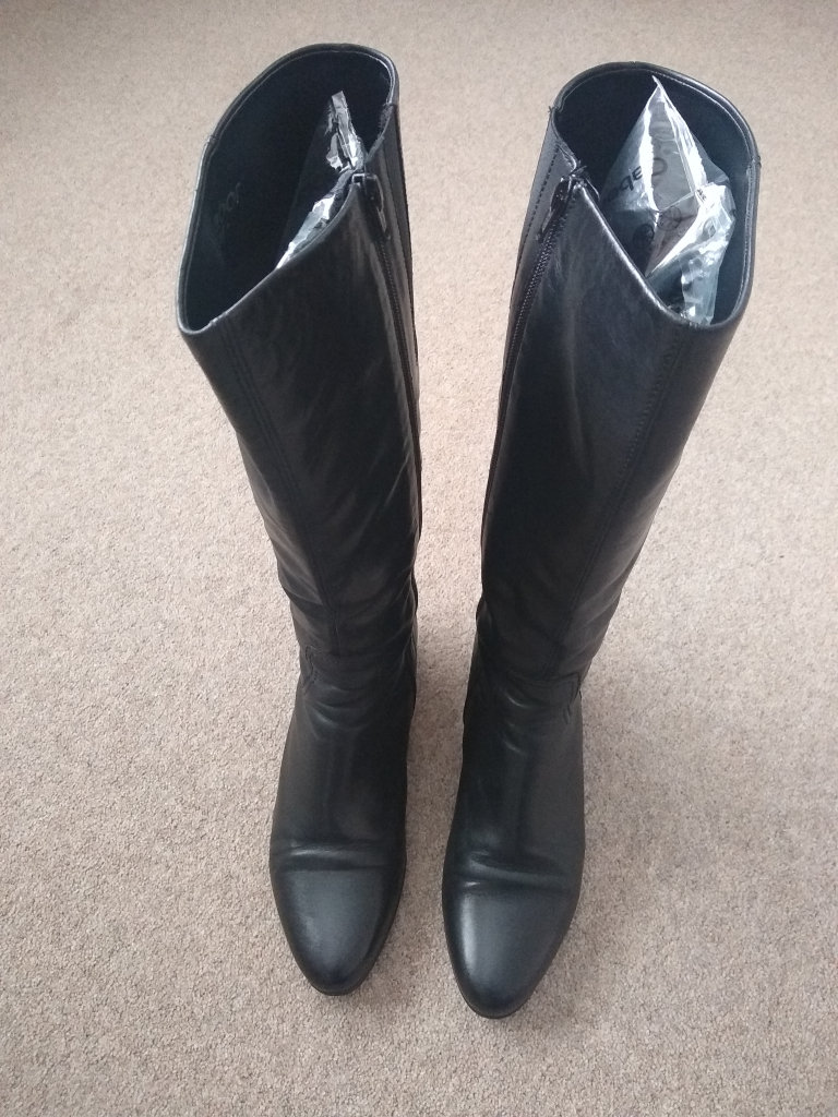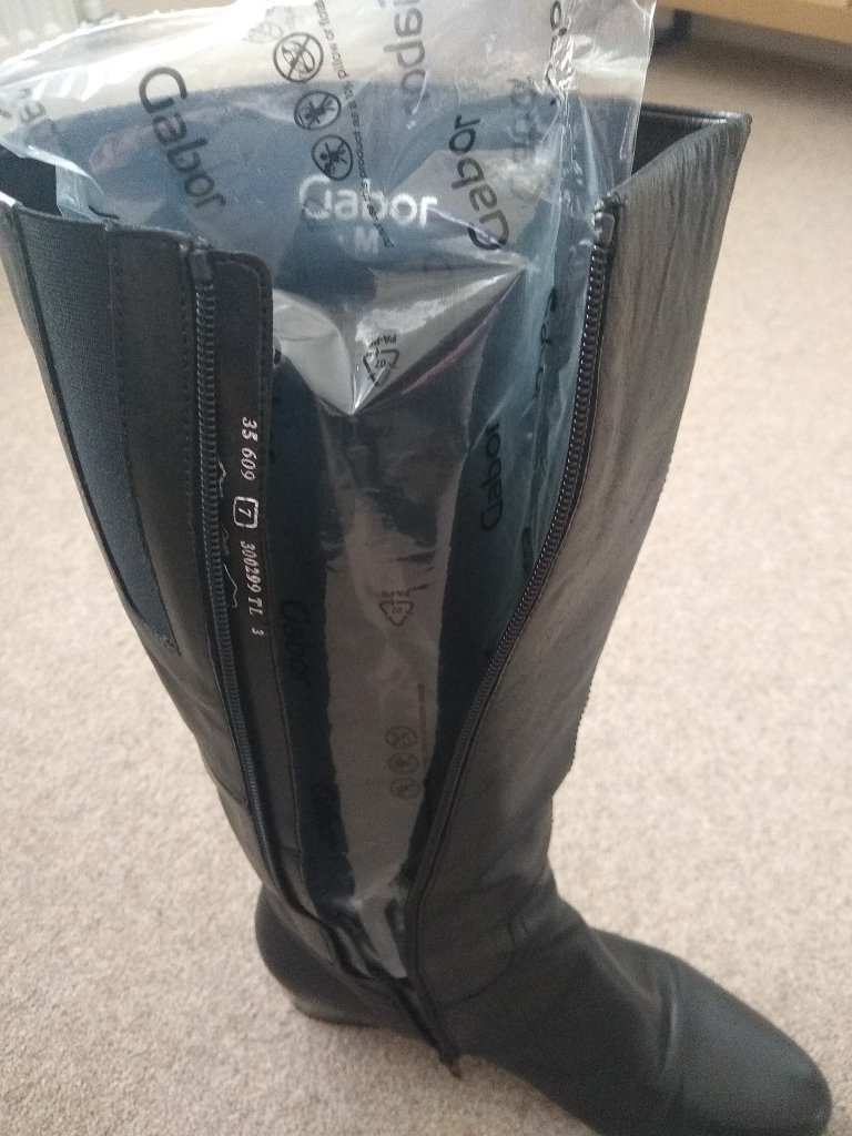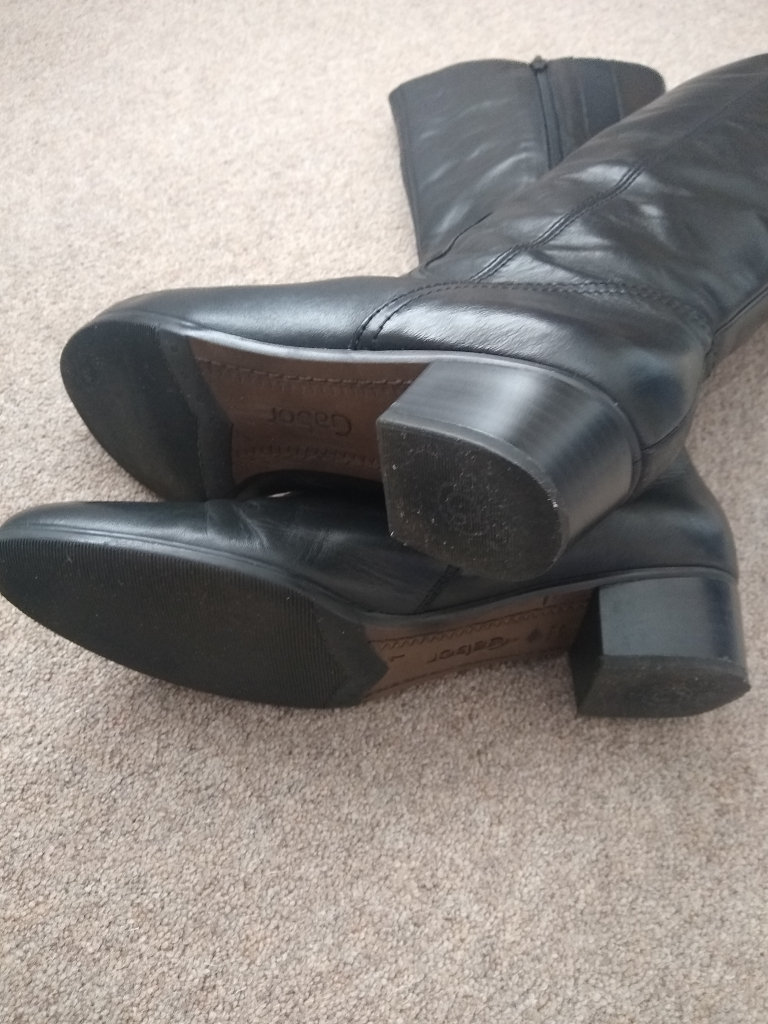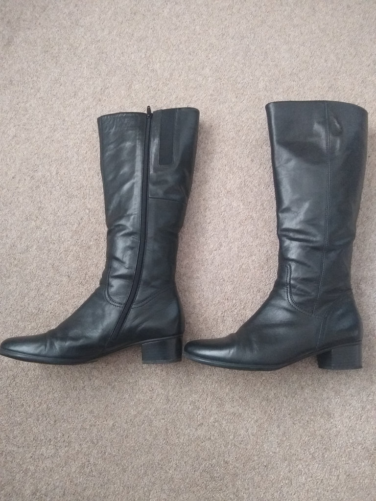 Gabor knee high black leather boots. UK Size 7, 38cm high with a 3.5cm heel. Hardly worn as can be seen by the soles. With original box and plastic inflated boot supports.