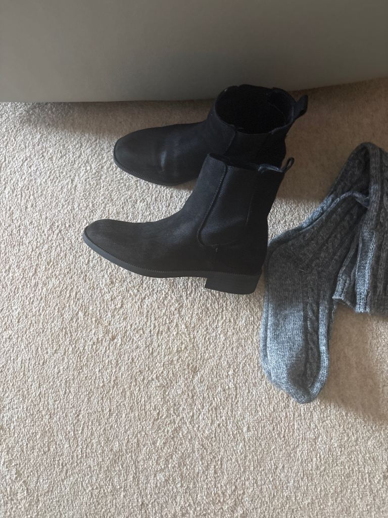 For sale in excellent condition in ladies size 39/6 black suede Chelsea boots from Next and M&S grey cable knit long socks to create a cuff appearance.