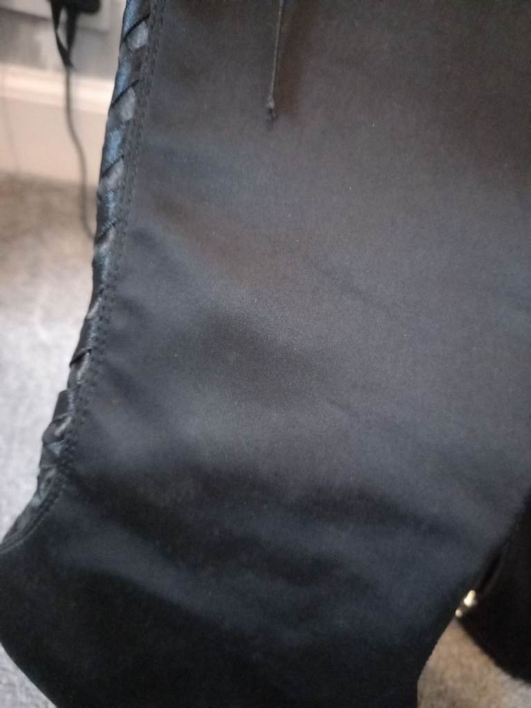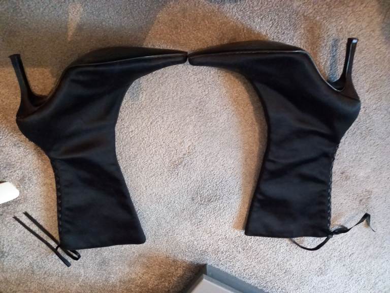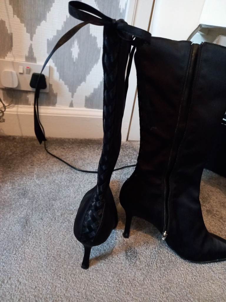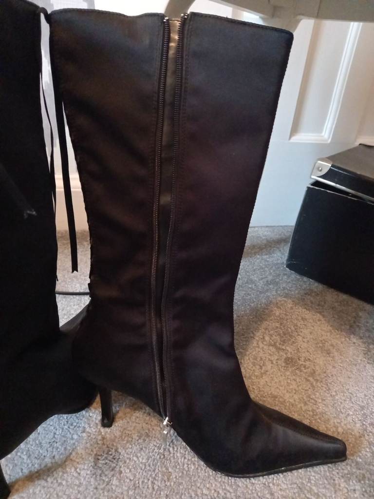 LOVELY LADIES BLACK SATIN STYLE POINTED HEEL BOOTS WITH LACE UP BACK AND ZIP FASTENING.