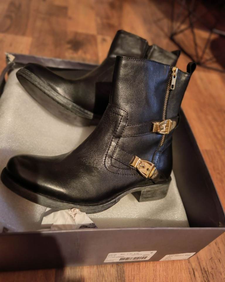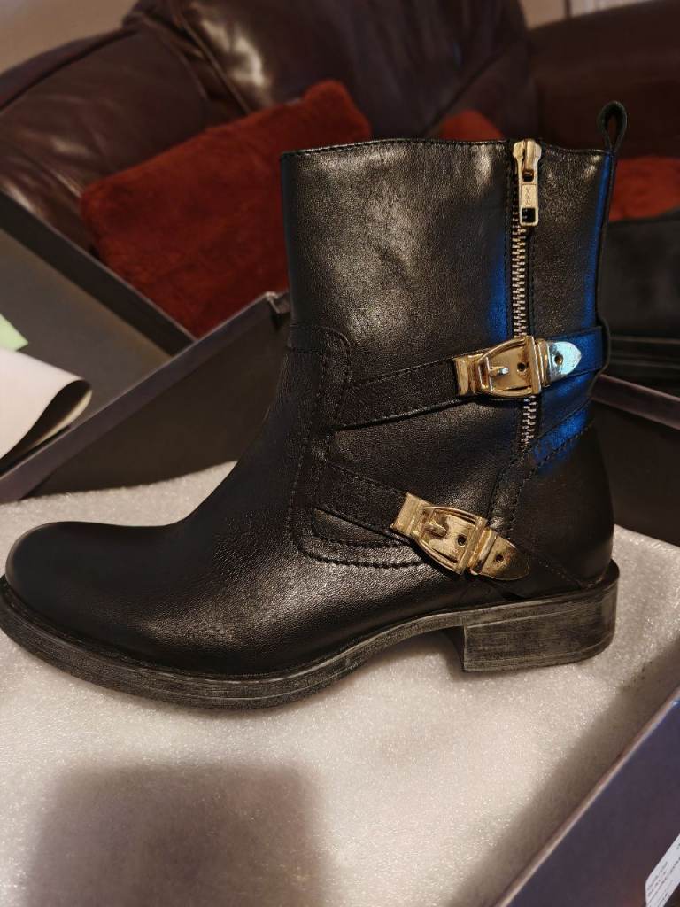 Black leather biker boots size 4 from Ravel absolute bargain. Side zip fastening. Gold buckle design. I have the box but it is damaged. Brand new. Collection only sr2