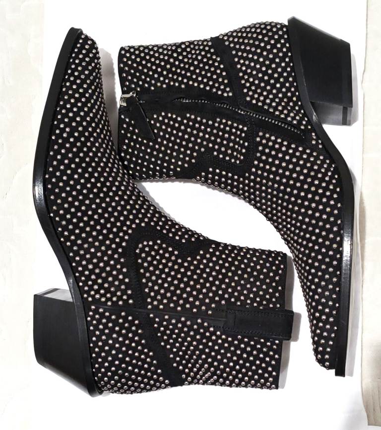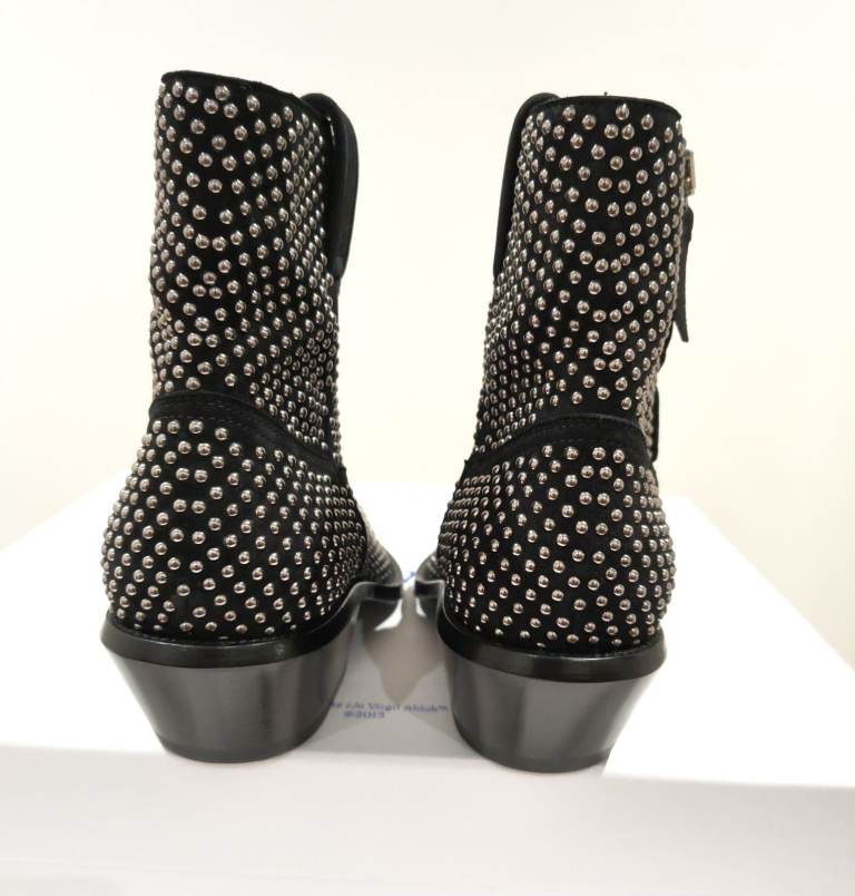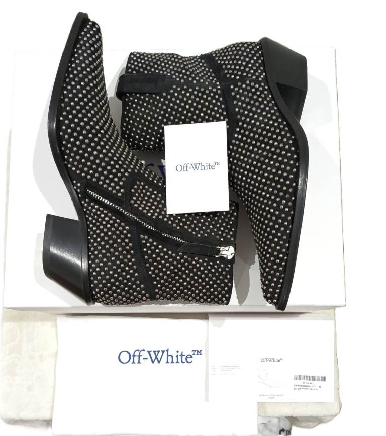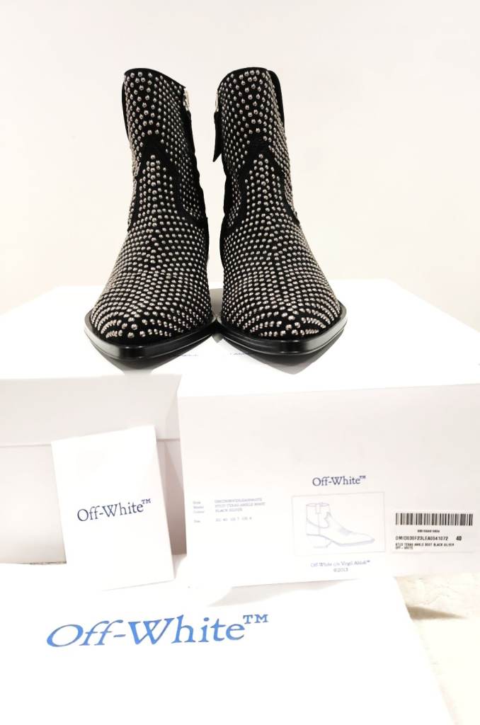 Elevate your style and Treat yourself or someone special with these authentic brand new Off-White x Virgil Abloh studded Texas ankle boots, crafted in premium black suede with striking silver stud detailing.