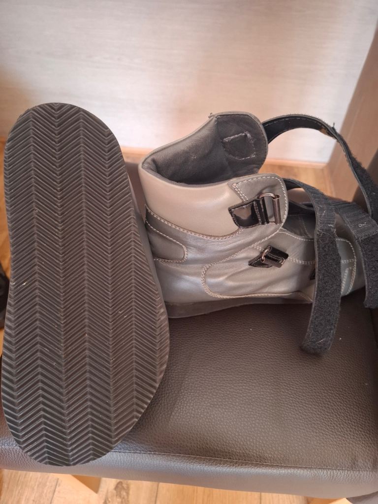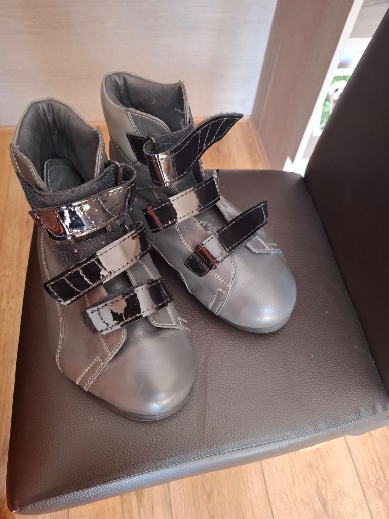 Grey boots for wide feet. Suit size 6 and made from orthotics. Only been tried on and never worn outside. Grey in colour with black patent straps .