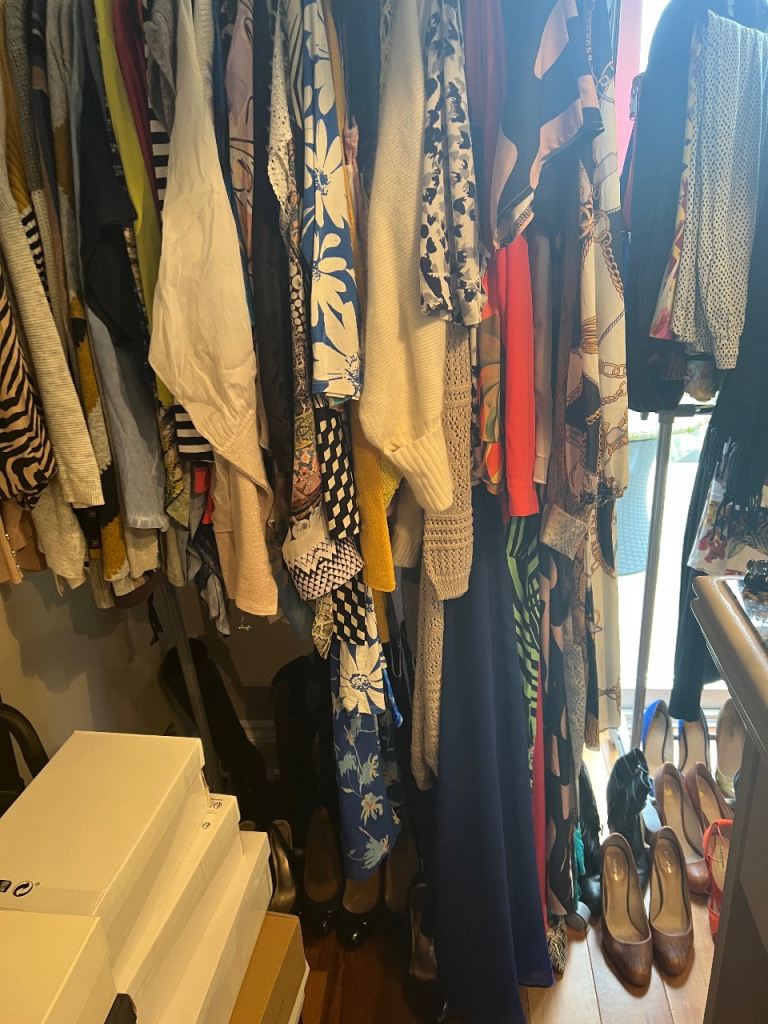 Mixed bundle of ladies tops, jumpers, dresses, trousers and evening wear in sizes 14 -16 with some size 12s. L K Bennett and other designers plus high street brands. Shoes and boots size 39 and 40 (6½ - 7). Over £2,000 worth and many items never worn.