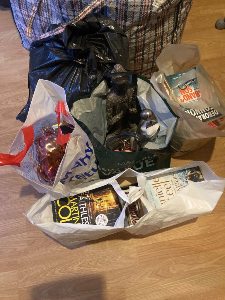 Large bundle of clothes and handbags, plus some books. Mostly women’s clothes, condition of which vary between new with tags, unworn, vgc, or used. Sizes will range from approx size 10, up to size 16.