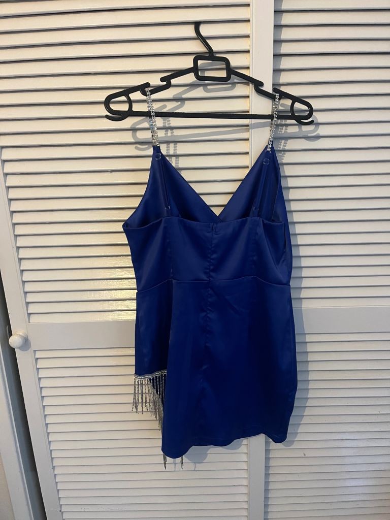 Can deliver stylish royal blue mini dress, likely made of satin, featuring a V-neckline and distinctive rhinestone fringe detailing on one side. This type of dress is ideal for special occasions like parties or cocktails, offering a blend of elegance and a touch of sparkle. A few marks rhinestones have came off☹️ but still a lovely dress 🙂