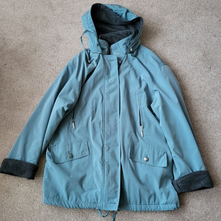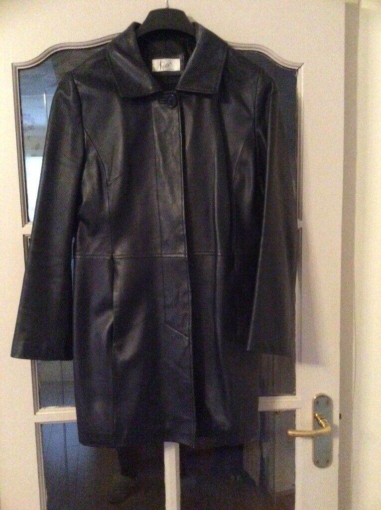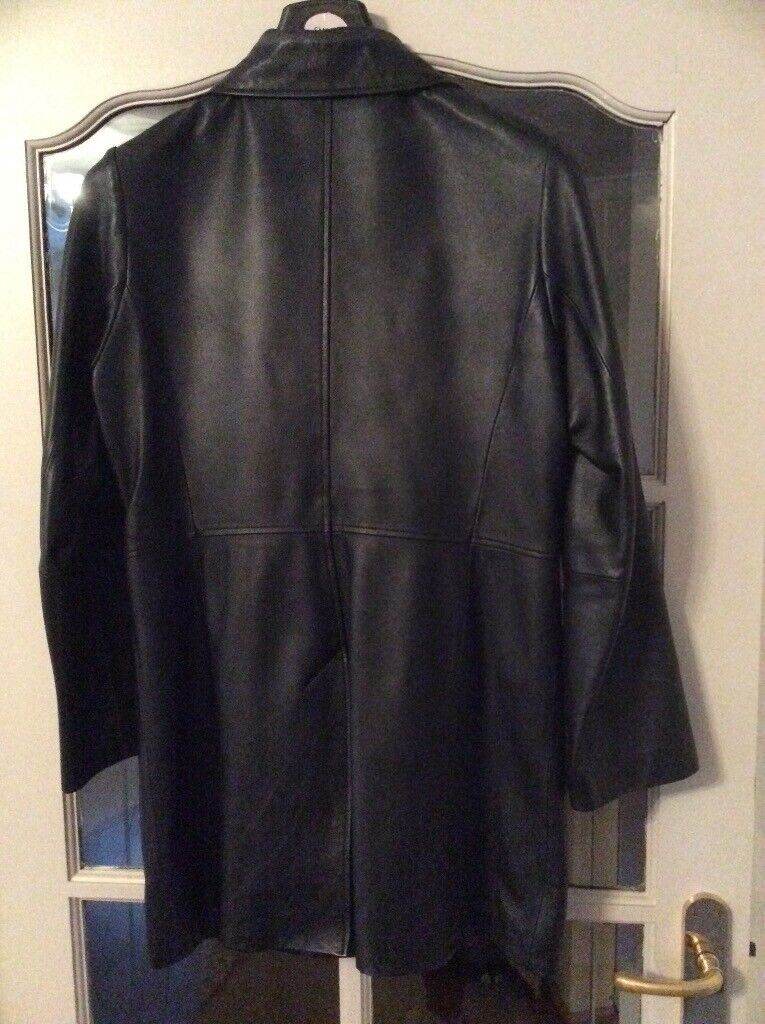 Black leather coat size 14. Concealed buttons and pockets.82 cm long. Only worn half dozen times.Great condition from non smoking home. Collection only from East Kilbride.