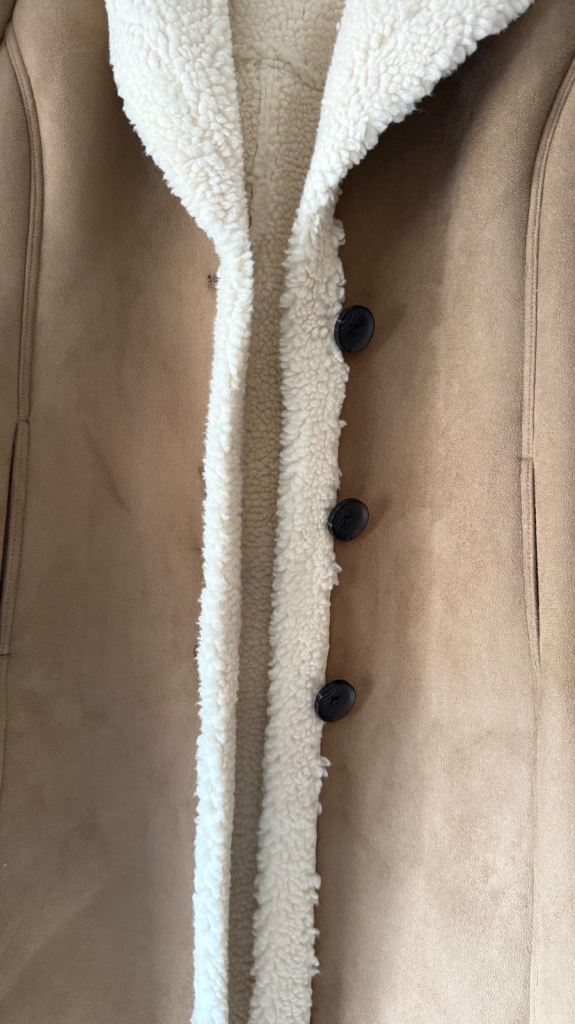 This brown faux shearling coat has a lovely soft polyester texture that features two large collars and comes lined for extra added warmth with three buttons for closure.