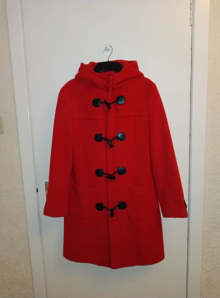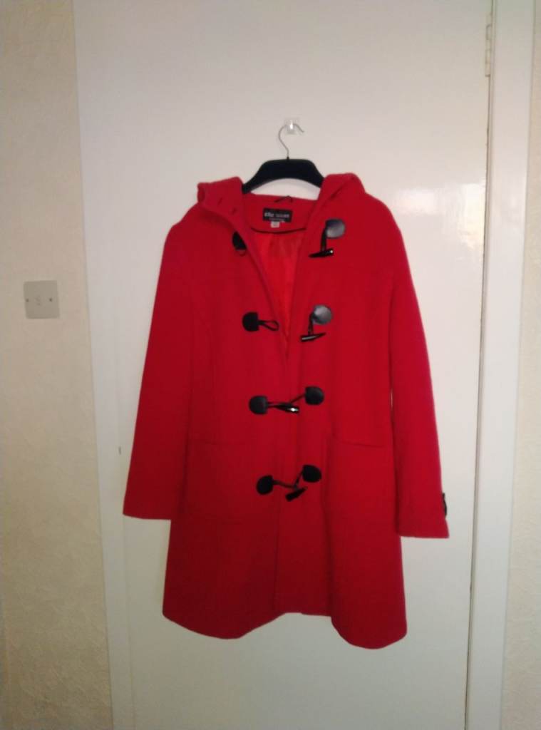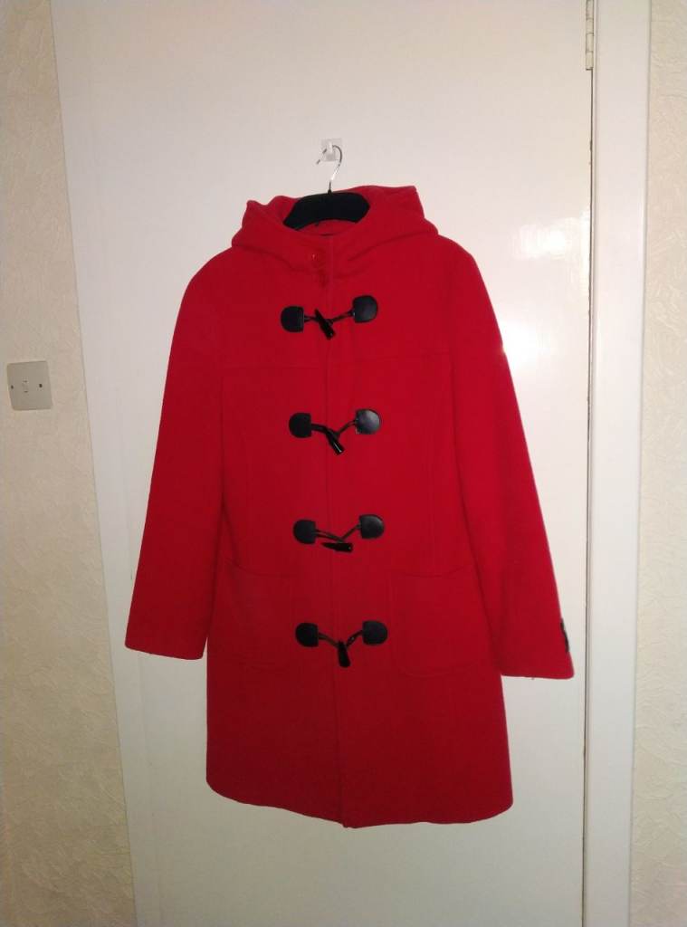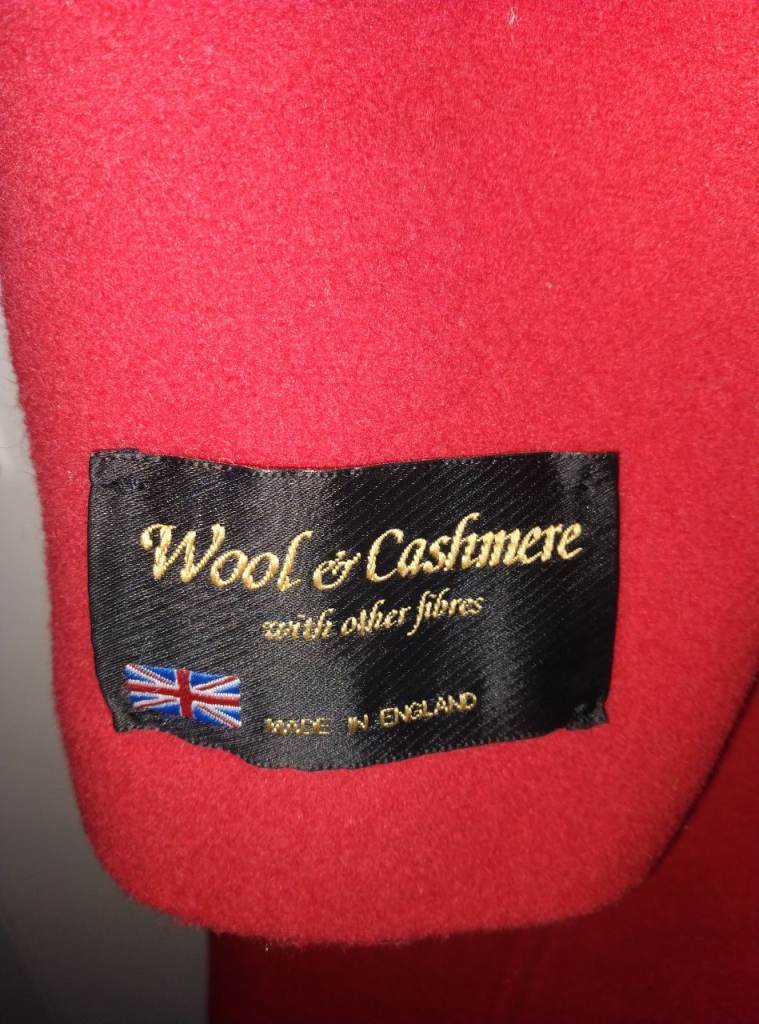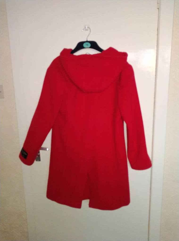 Lovely coat with attached hood two side pockets and toggle fasteners really warm and stylish to wear. Made in England Cashmere Wool and other fabrics.