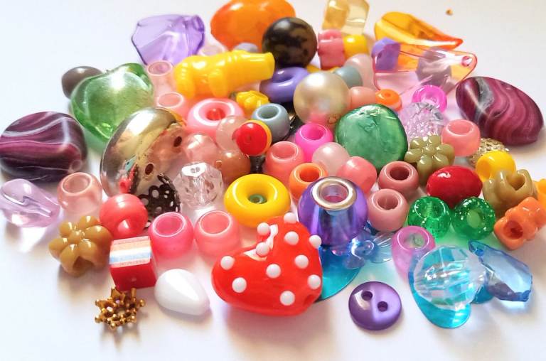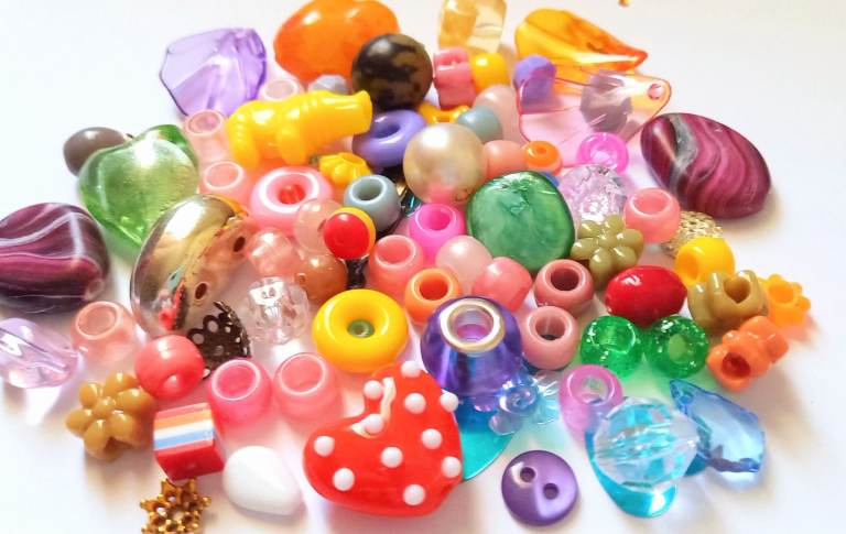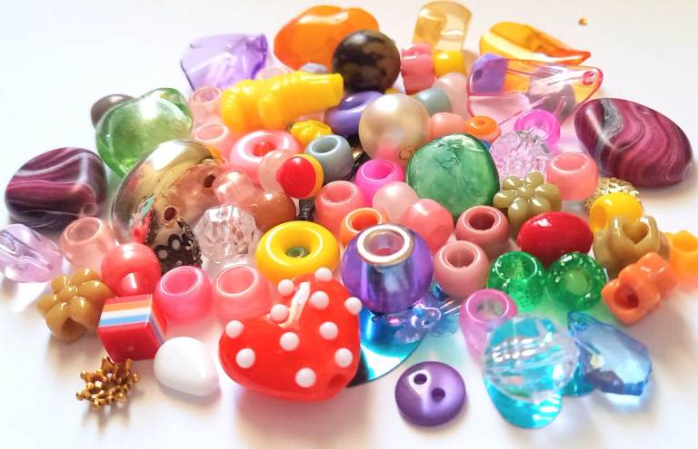 For jewellery making and other art projects. Mix of beads and sequins, resin acrylic metal wood etc.