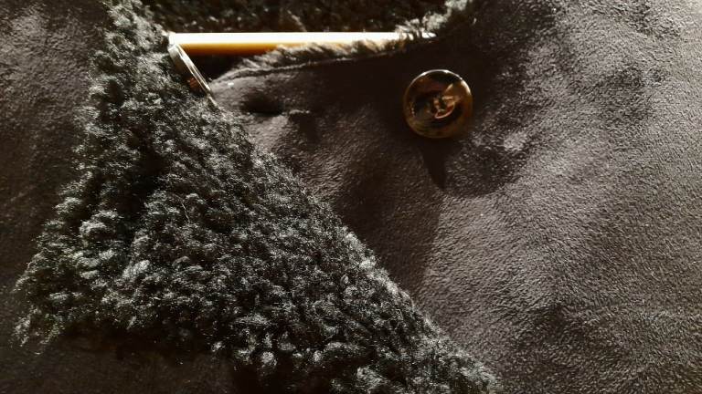 Faux jet black suede with Astrakhan like curly, Looped wool like inside.