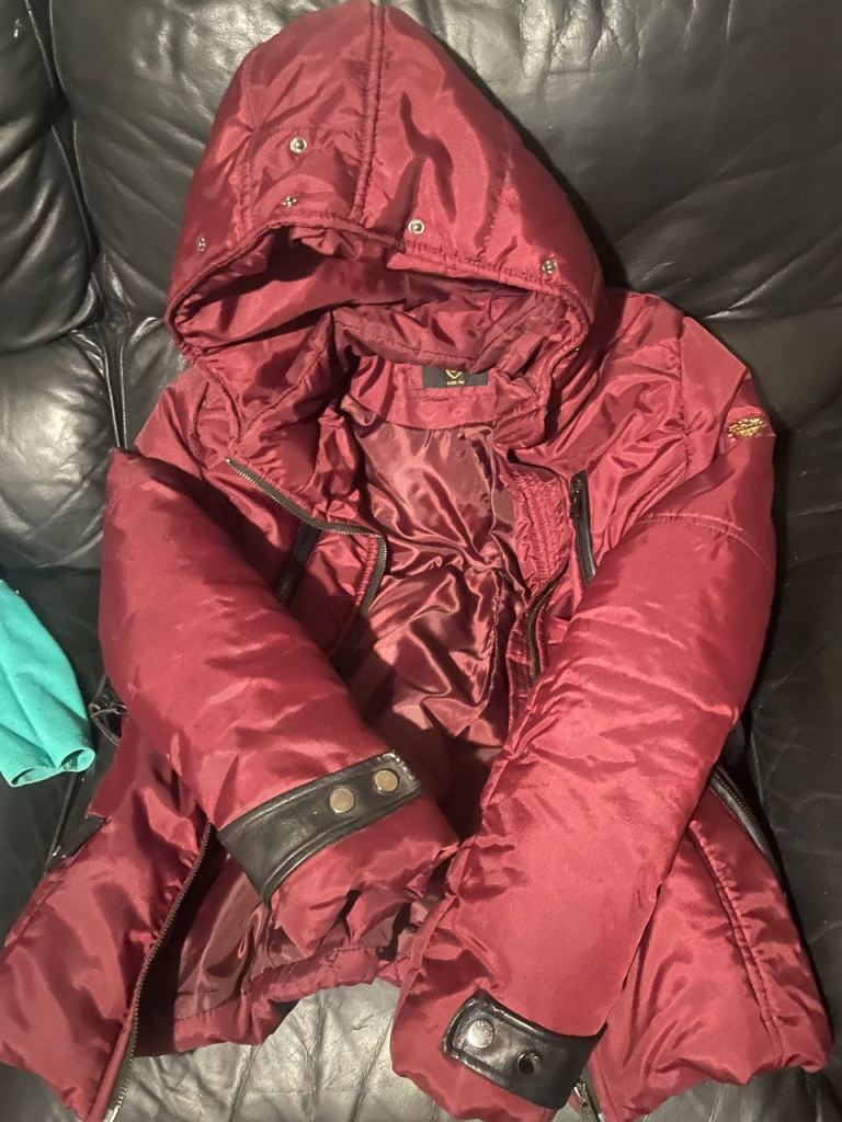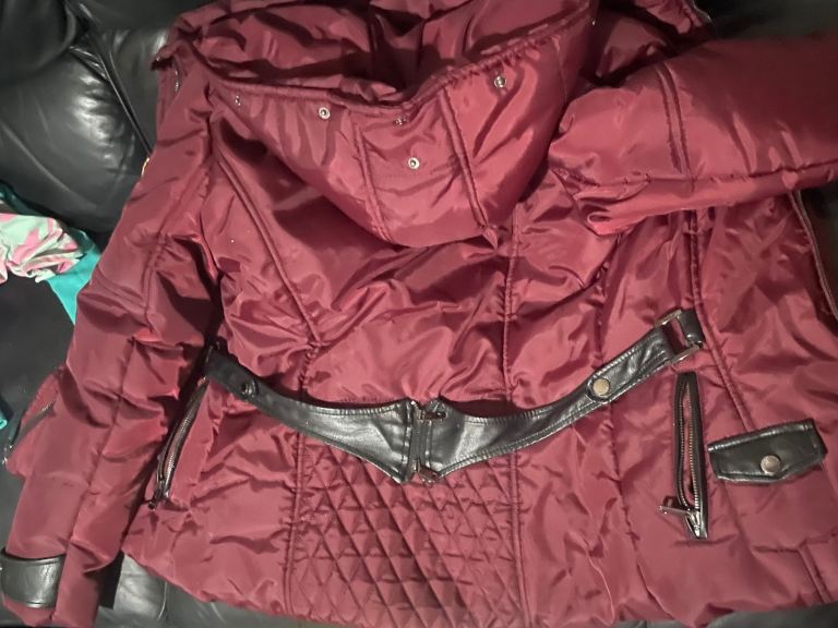 Women’s wine red jay loucy, size 42 best fits size 12, worn once, detachable real fur, belt for cinched waist, paid over £200 in fifty one Liverpool, £100 Ono