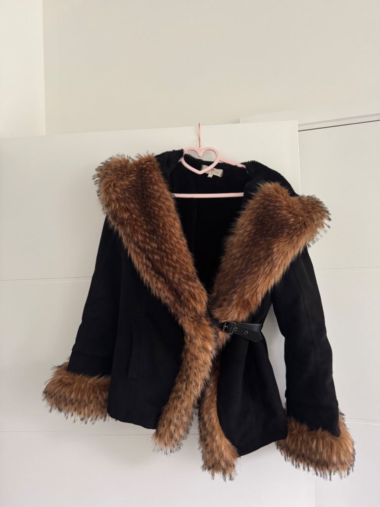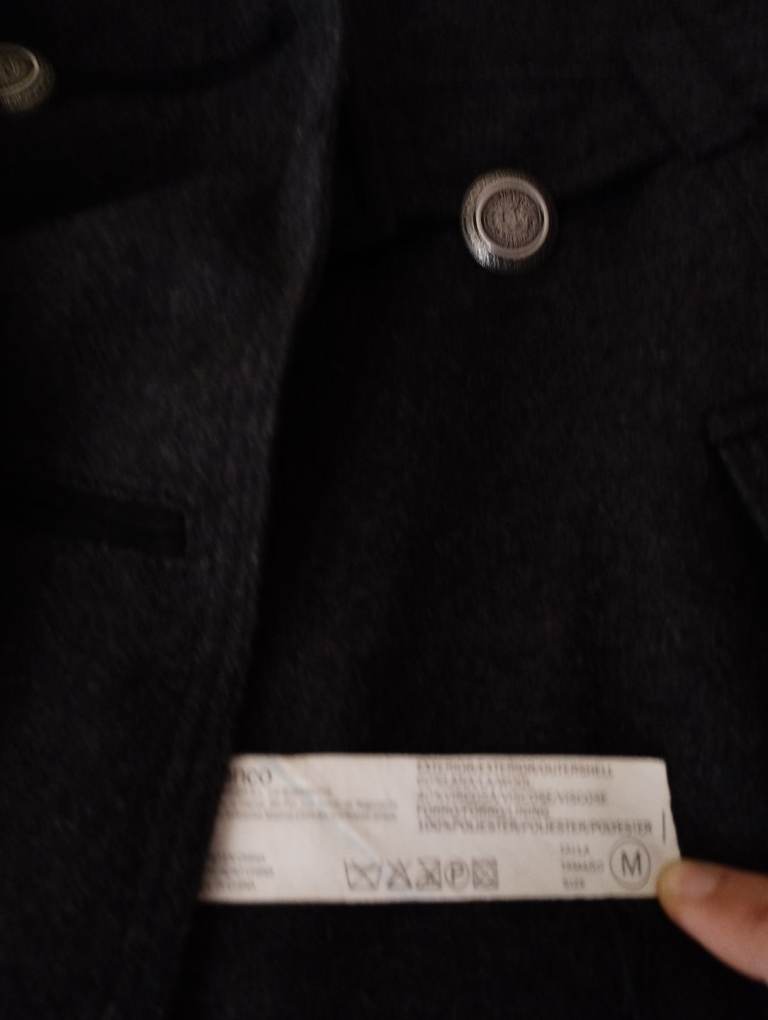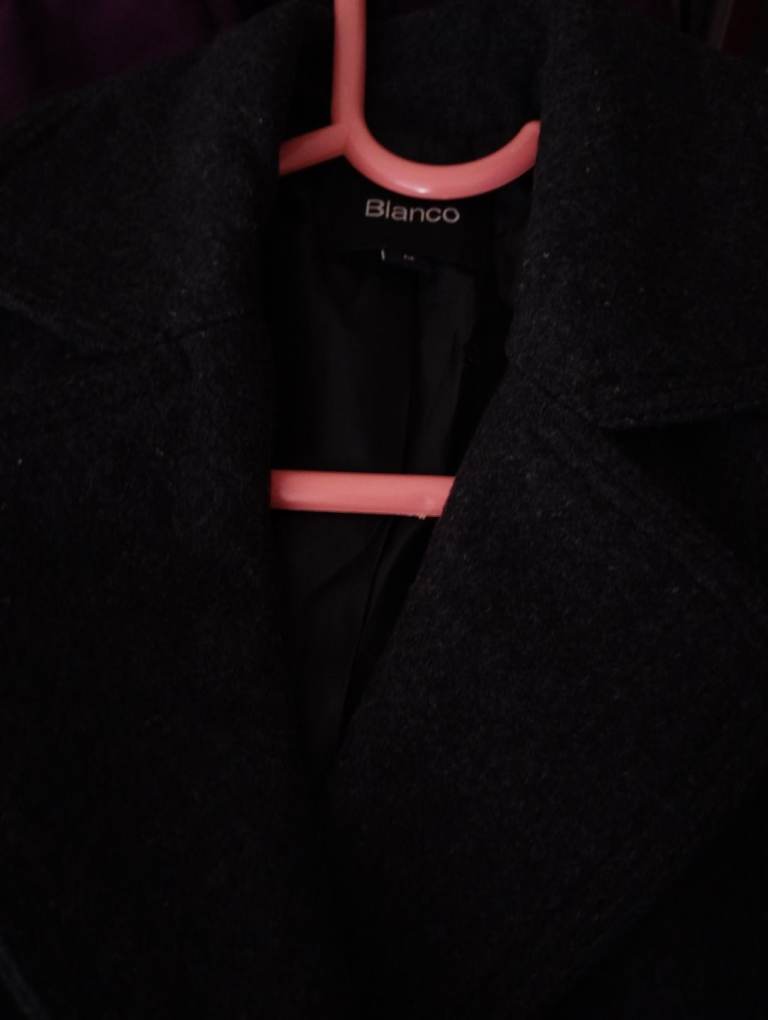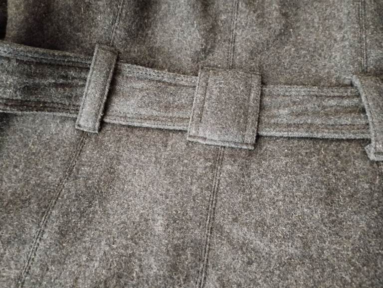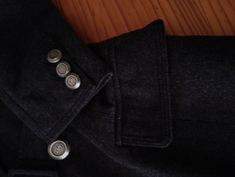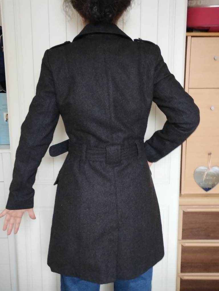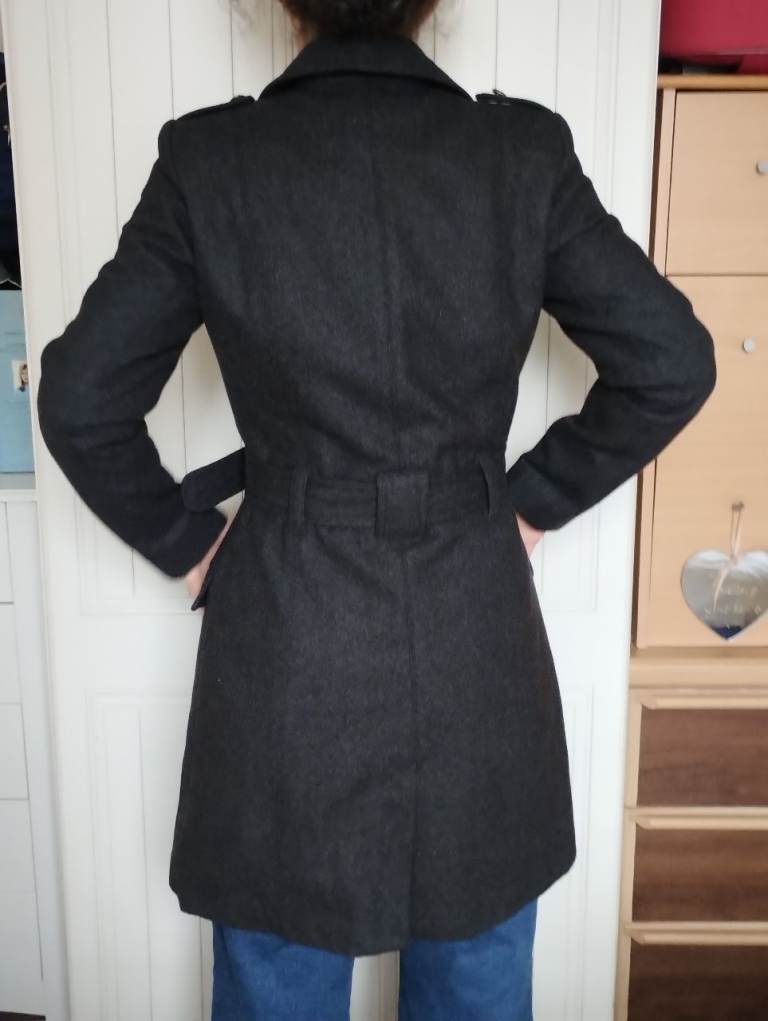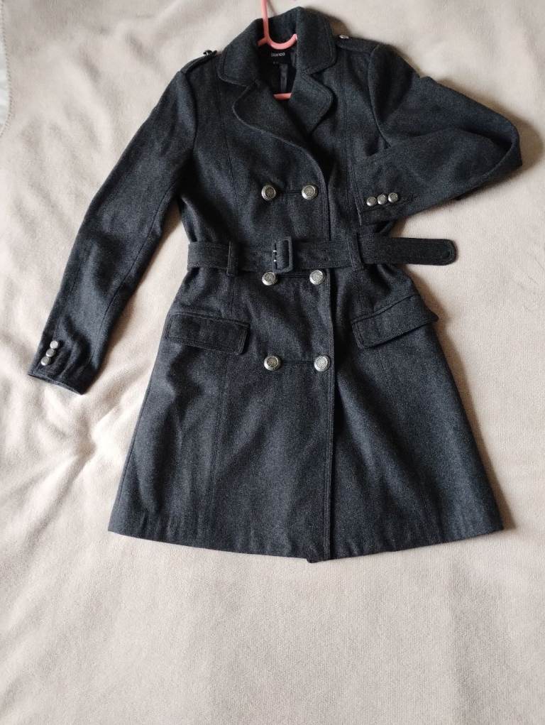 Lovely wool double breasted military coat with metallic buttons and belt. 2 front pockets. From iconic Spanish Blanco brand. Double stitched seams. Medium size UK 12.