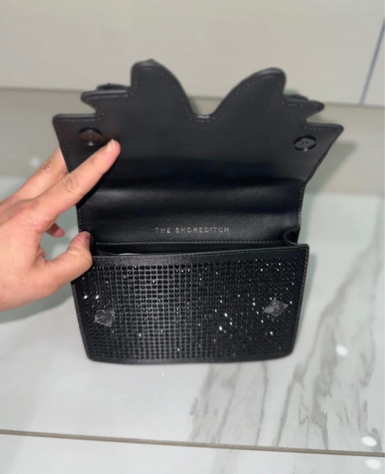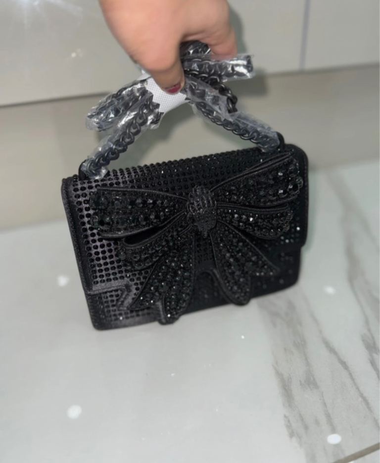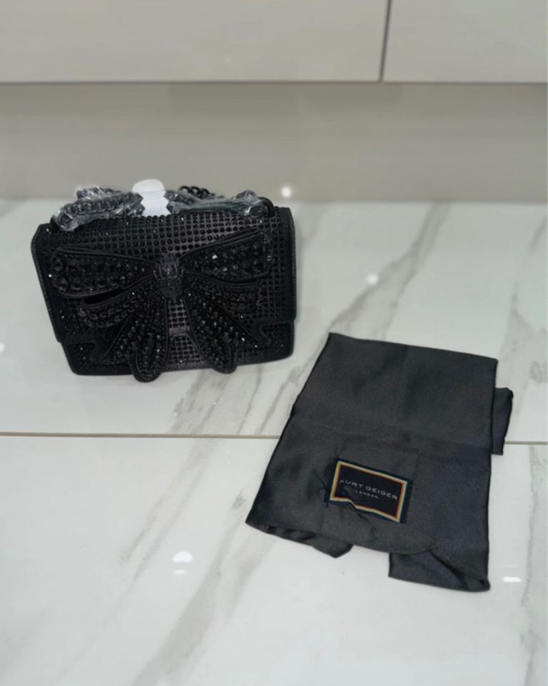 Brand new - Kurt Geiger - small - black - Shoreditch drench bow bag - crafted from a black satin. The front flap is topped with large, crystal bow and black eagle head with crystal detail on the front flap.