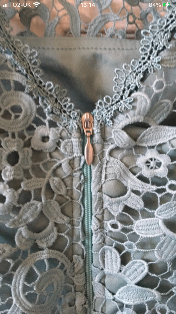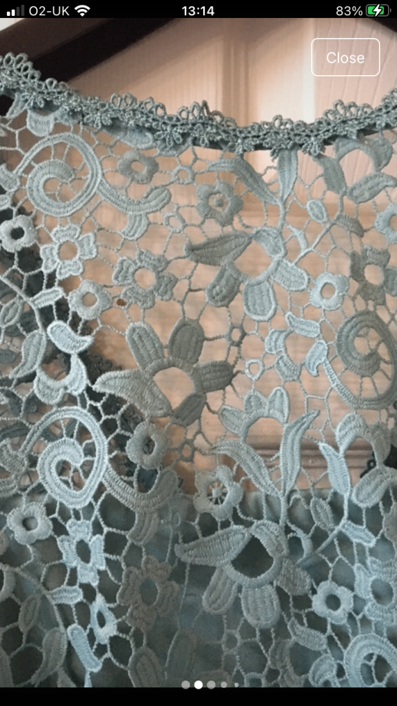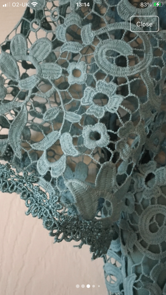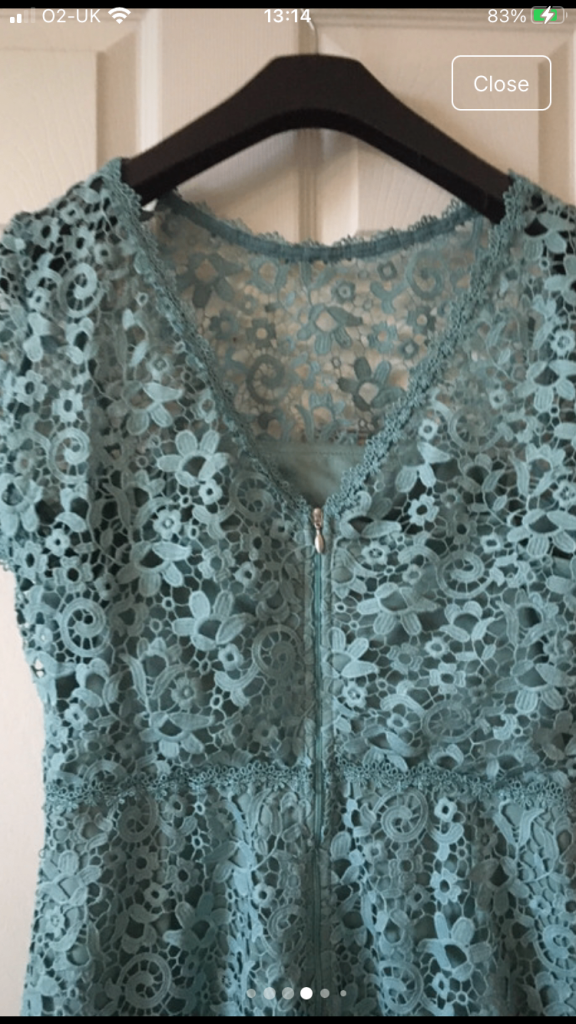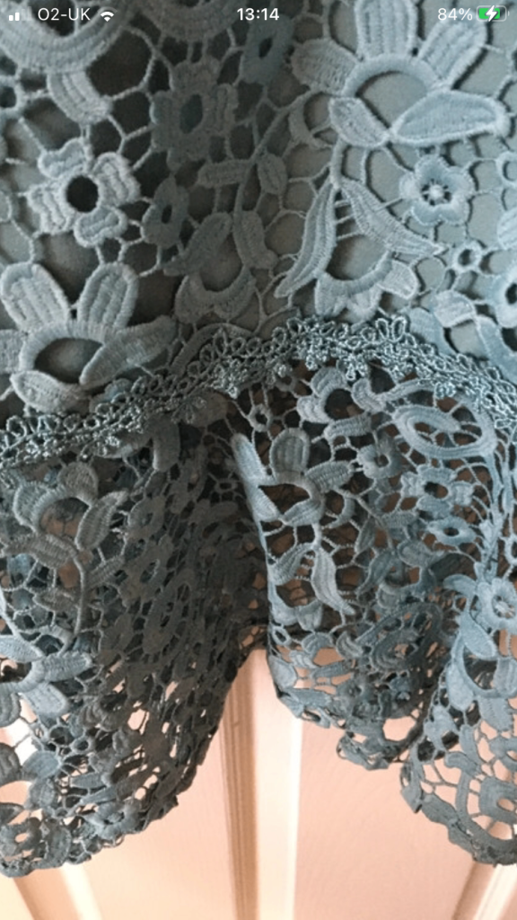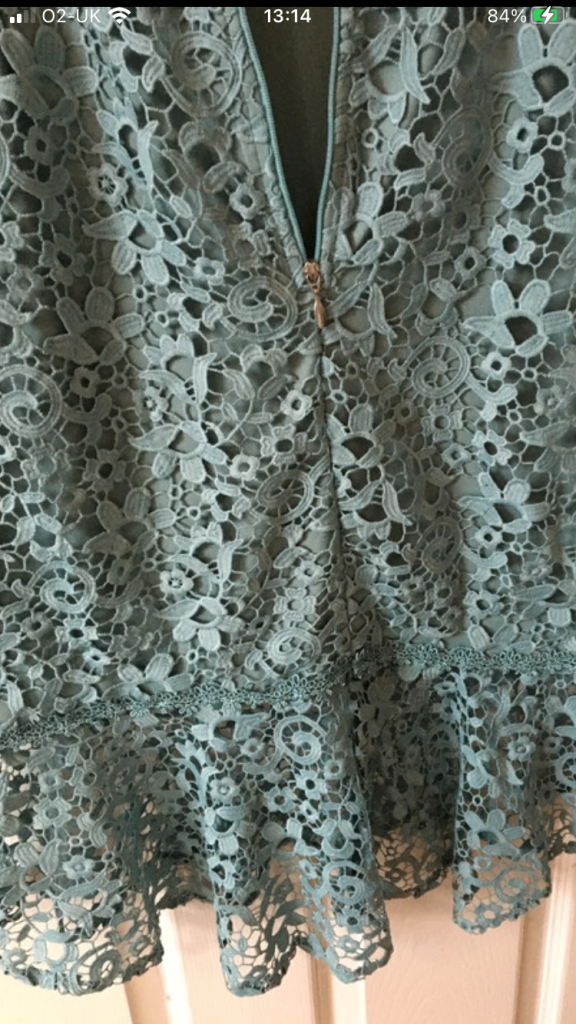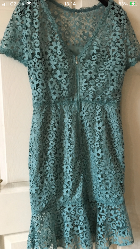 Lovely lace dress with frilled hem and v back . Very pretty teal colour ,part lined . Perfect for a Spring / Summer wedding / christening/ Garden Party . Never worn !