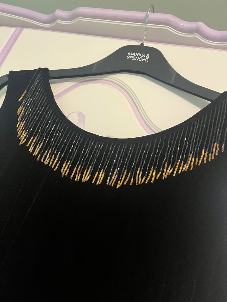 Has beautiful black and orange beaded sparkle fringing to neckline