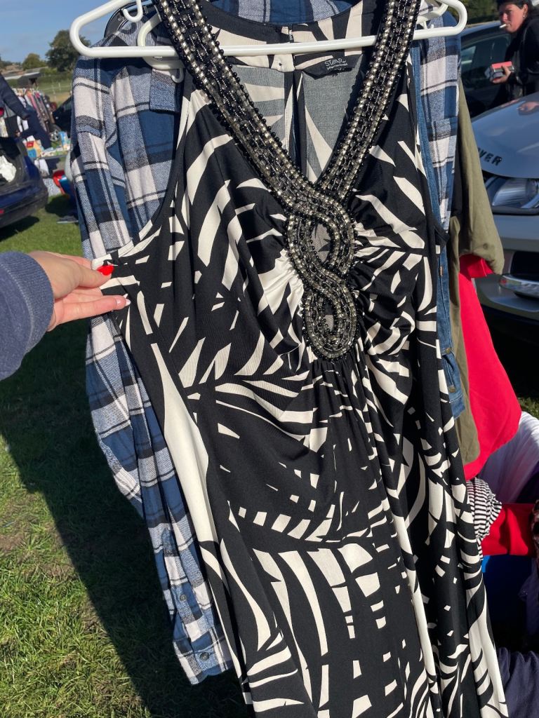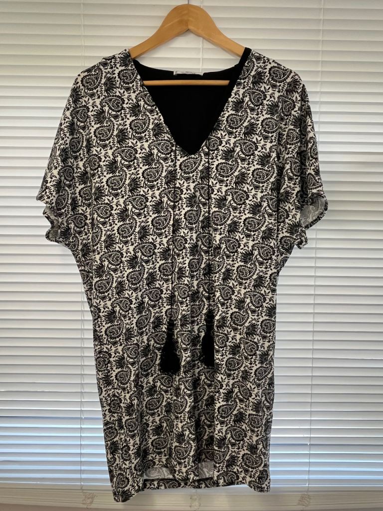 BRAND NEW Stunning Border Print Dress size 14.Colour Sea Touquise Green & Gold with a cream beaded tie neck line.Ideal dress to wear to a WEDDING or GARDEN Party.Bought in a little individual boutique in the spring for £140 ,NOW advertising at 1/3 of this price.This dress still got label & has NEVER BEEN WORN due to buying wrong size & not keeping the receipt to be able to return.Beautiful quality material.