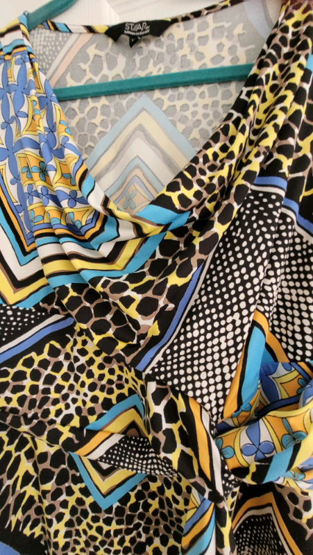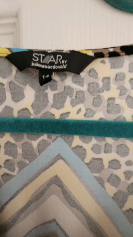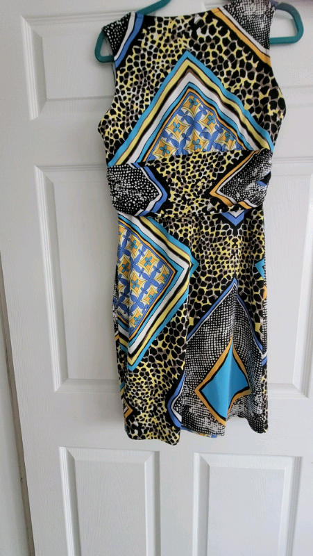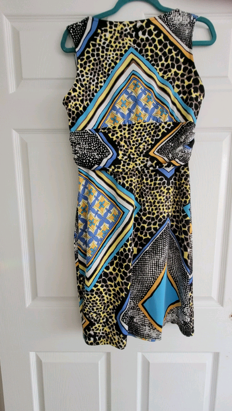 Beautiful Julien MacDonald dress size 14. True to size. Worn once. Beautiful bright colours, lemon, blue,black,cream. Pull on dress with plenty of stretch. Hangs beautifully. Would be lovely for any occasion. Having a clear out so please look at my other items. Open to reasonable offers.