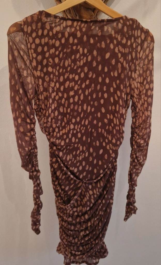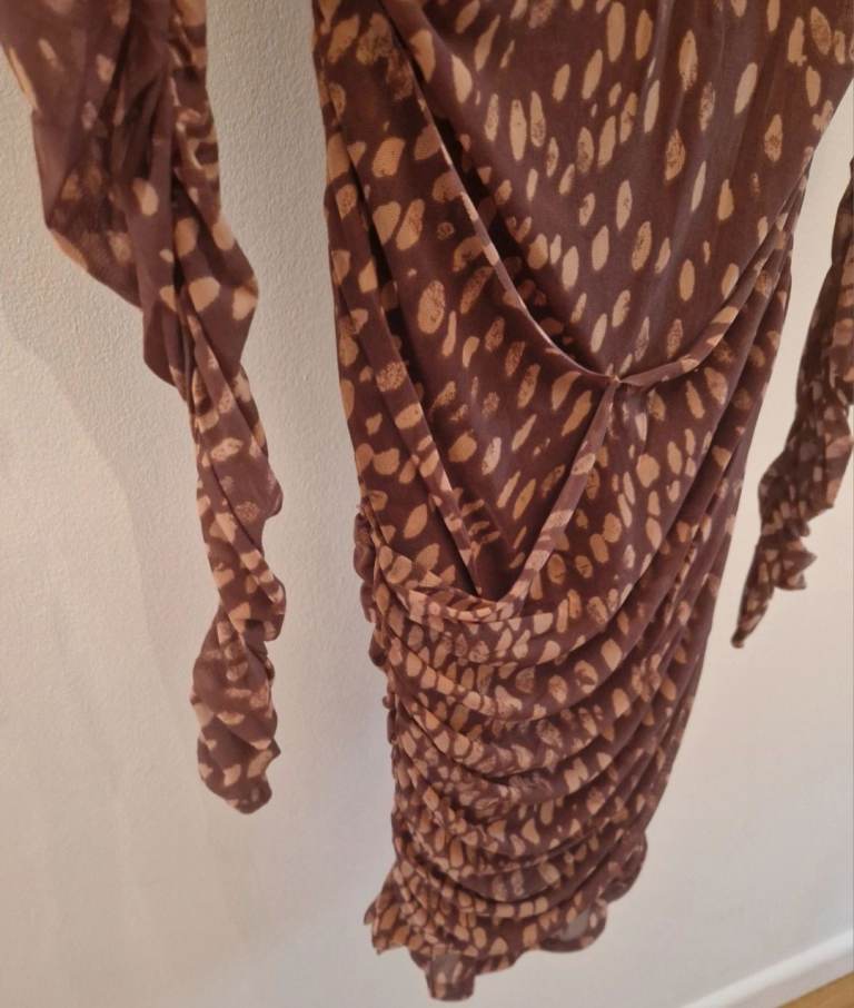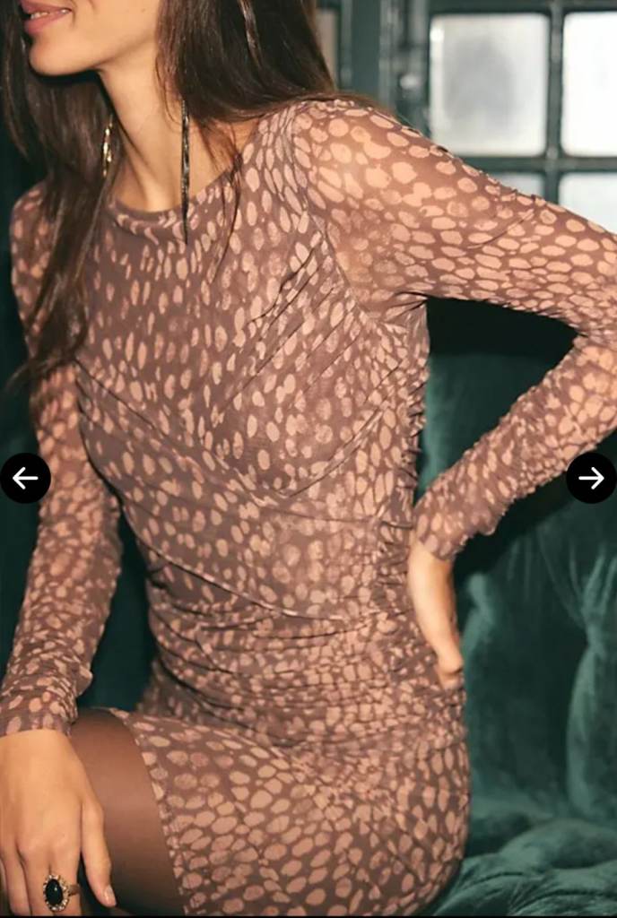 Features: Printed mesh fabrication, boat-neckline, fitted long-sleeves, ruched detail throughout the body